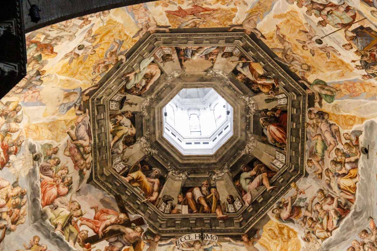 La voûte de la coupole est ornée d’un fresque, œuvre gigantesque, représentant le « Jugement Universel », peinte en trompe-l’oeil par Vasari et Zuccari…