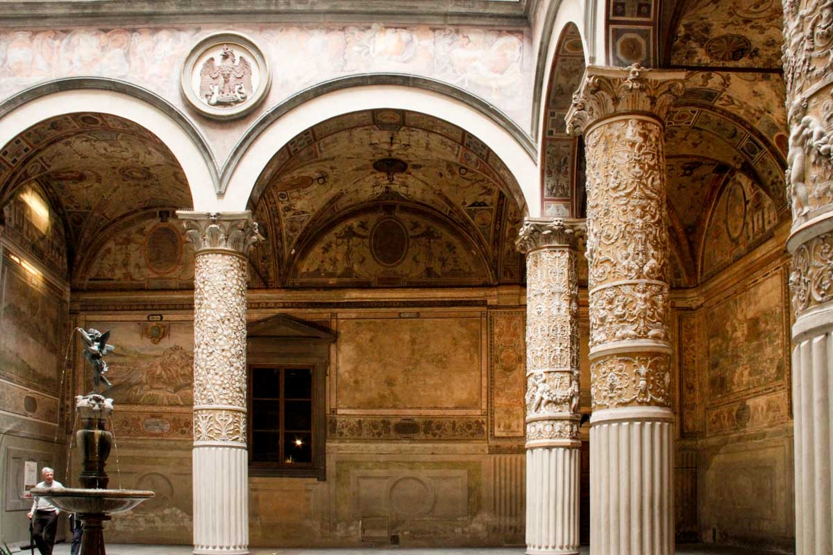 La première cour du Palazzo Vecchio, appelée Cortile di Michelozzo, est ornée de fresques, de colonnes recouvertes de stucs et d'une fontaine