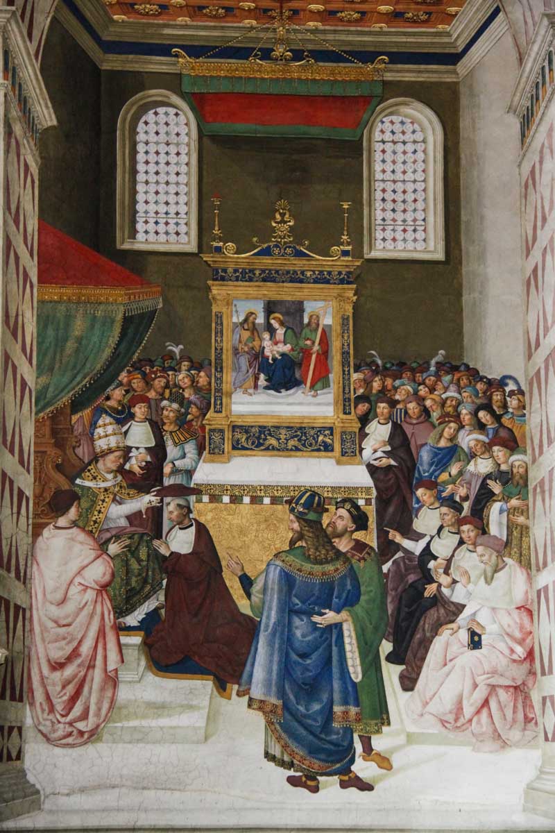 Elle est entourée de panneaux ornés de fresques peintes par le Pinturicchio et ses élèves