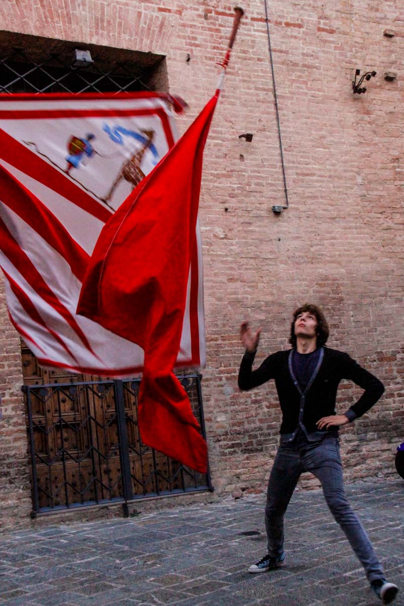 Sur une placette, deux jeunes s’entraînent à manier le drapeau à l’effigie de leur quartier, peut-être en vue de la grande fête du Palio ?…