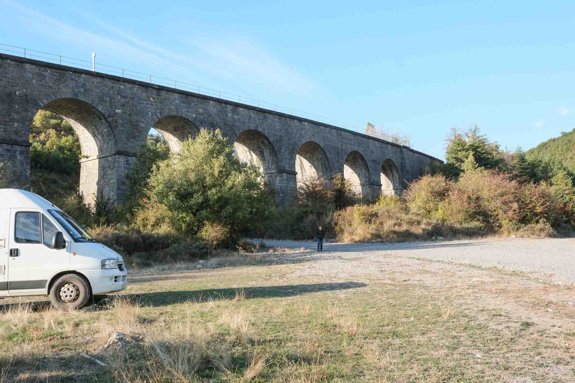 Et nous arrivons dans un joli coin entouré de versants couverts de végétation, aux tons dorés de l’automne. Un viaduc se dresse à côté sur lequel passe la voie ferrée. Nous sommes à près de 1000m d’altitude et le fond de l’air est très frais, malgré le soleil.