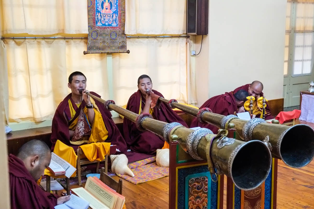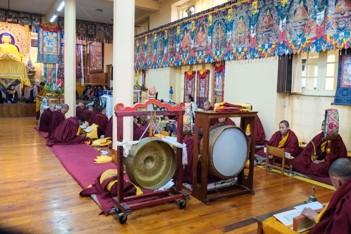 L’après-midi, nous allons au monastère du Dalaï-lama, le Namgyal Temple où nous avons la surprise d’assister à une cérémonie bouddhiste avec les moines récitant les mantras, soufflant dans des conques et dans des grandes trompes, tapant le tambour… tout le cérémonial extraordinaire et même les masques grimaçants qui exécutent des danses rituelles… et ça dure longtemps tout ça…