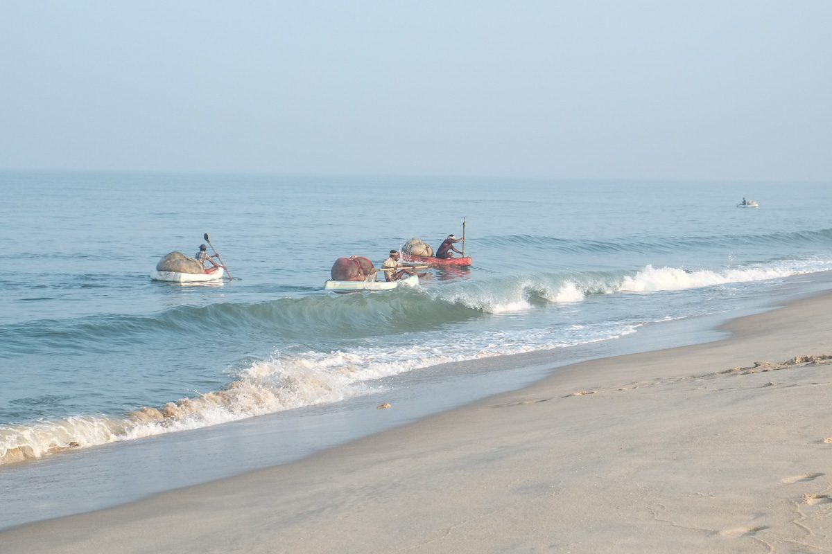 Le long de cette belle plage, il y a quelques villages de pêcheurs. On peut les voir revenir de la pêche le matin, à bord de leurs barques mais aussi sur de petits radeaux en polystyrène…