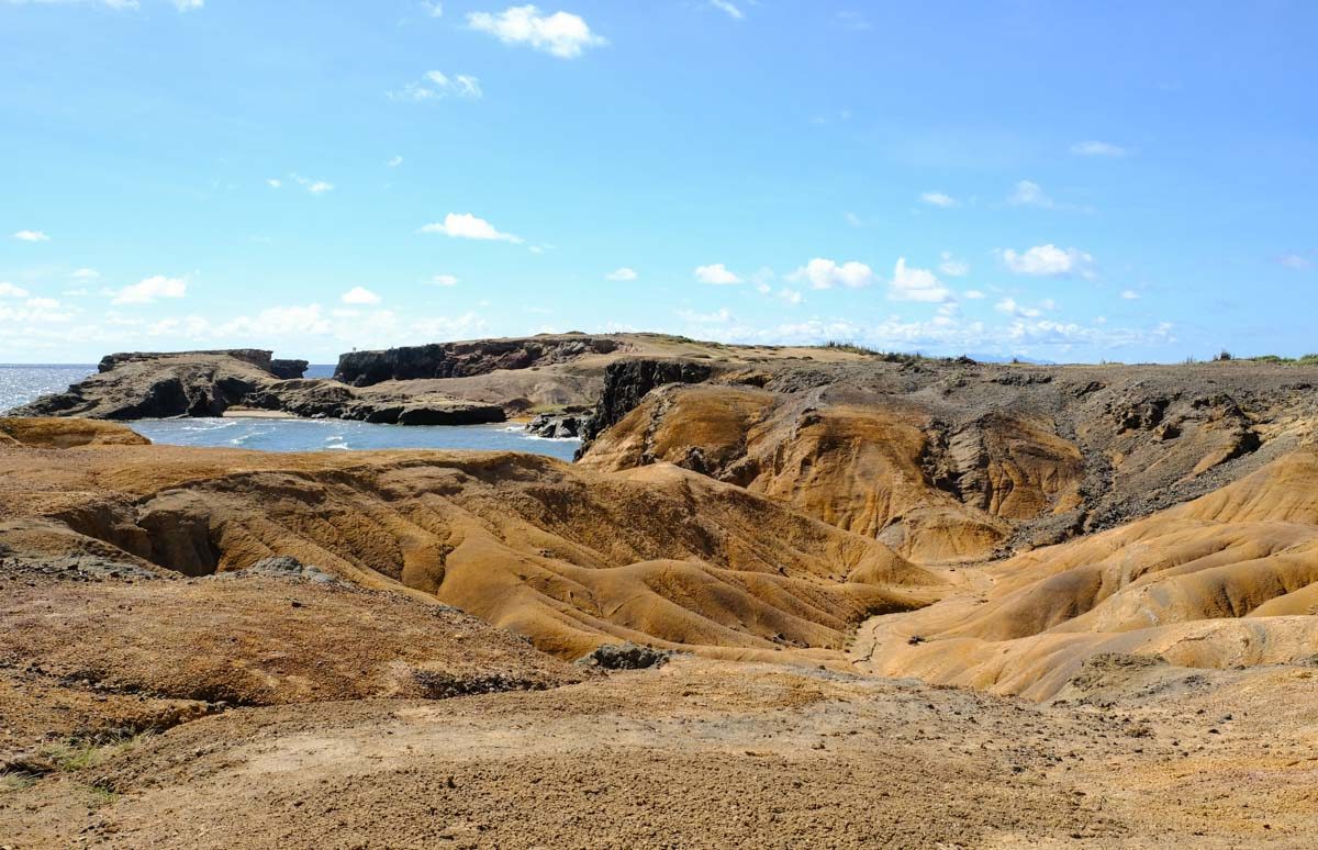 Petite plage tranquille, tout petit port de pêche, bon petit restau sympa (« Chez Maryse ») et la curiosité du coin : »D’lo ferré« , des sources ferrugineuses qui surgissent du pied du morne (la colline) qui borde la côte.