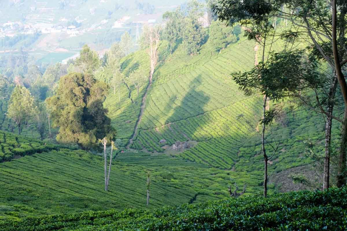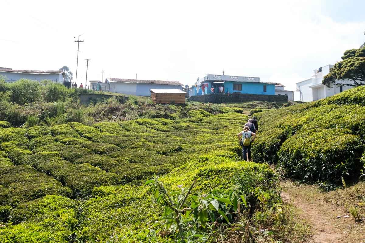 Pour retourner prendre le bus, il nous fait passer parmi les plantations de thé où il faut cheminer pendant un bon bout de temps pour arriver enfin au village le long de la route où passe le bus.