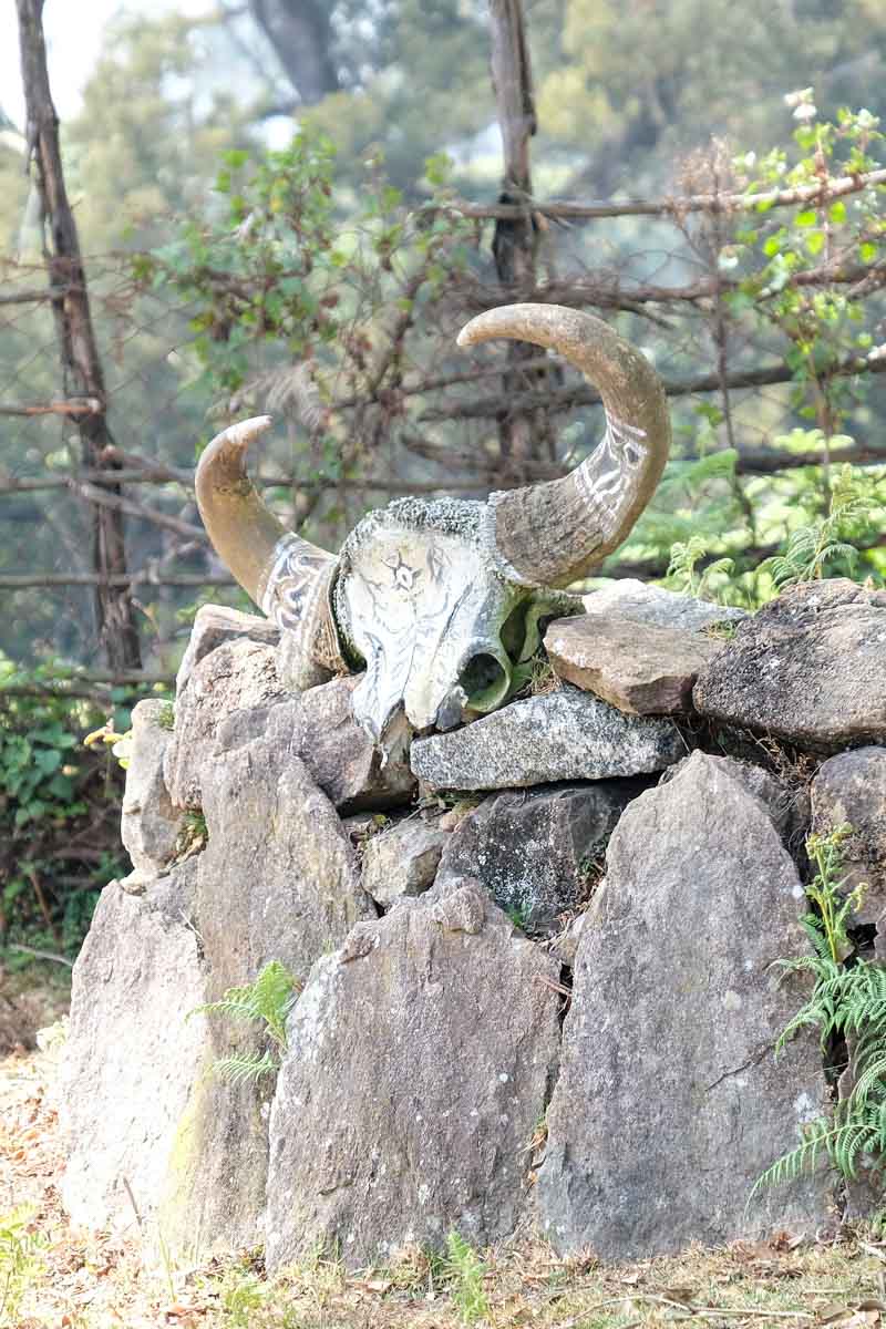 Ici, les gens sont animistes, ils vouent une adoration aux buffles dont des cornes sont posées devant le temple.
