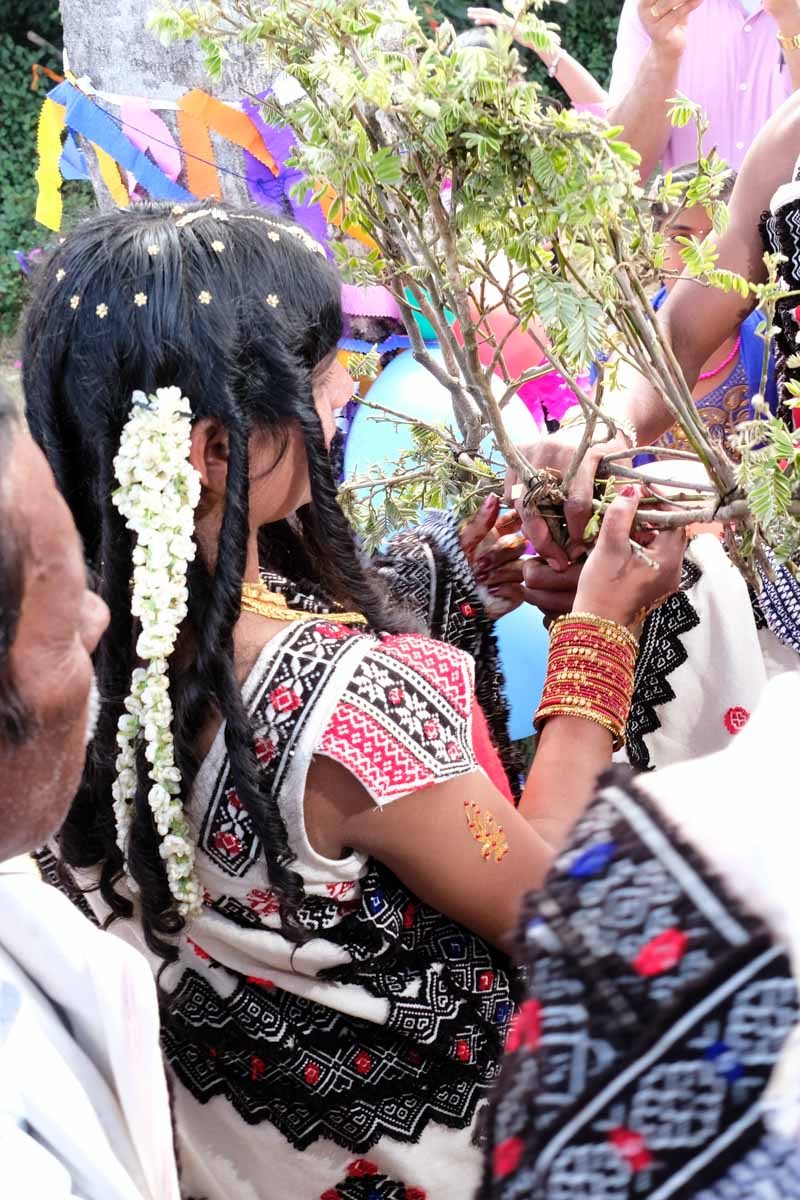 Puis, ils se livrent aux rituels : échange de branches pliées en arc au pied de l’arbre sacré. La mariée se recueille quelques instant devant cet arbre…