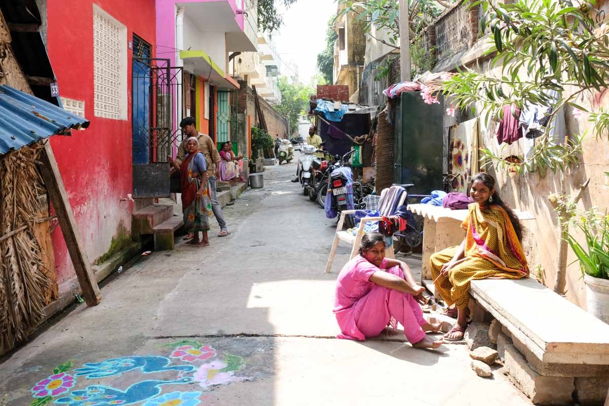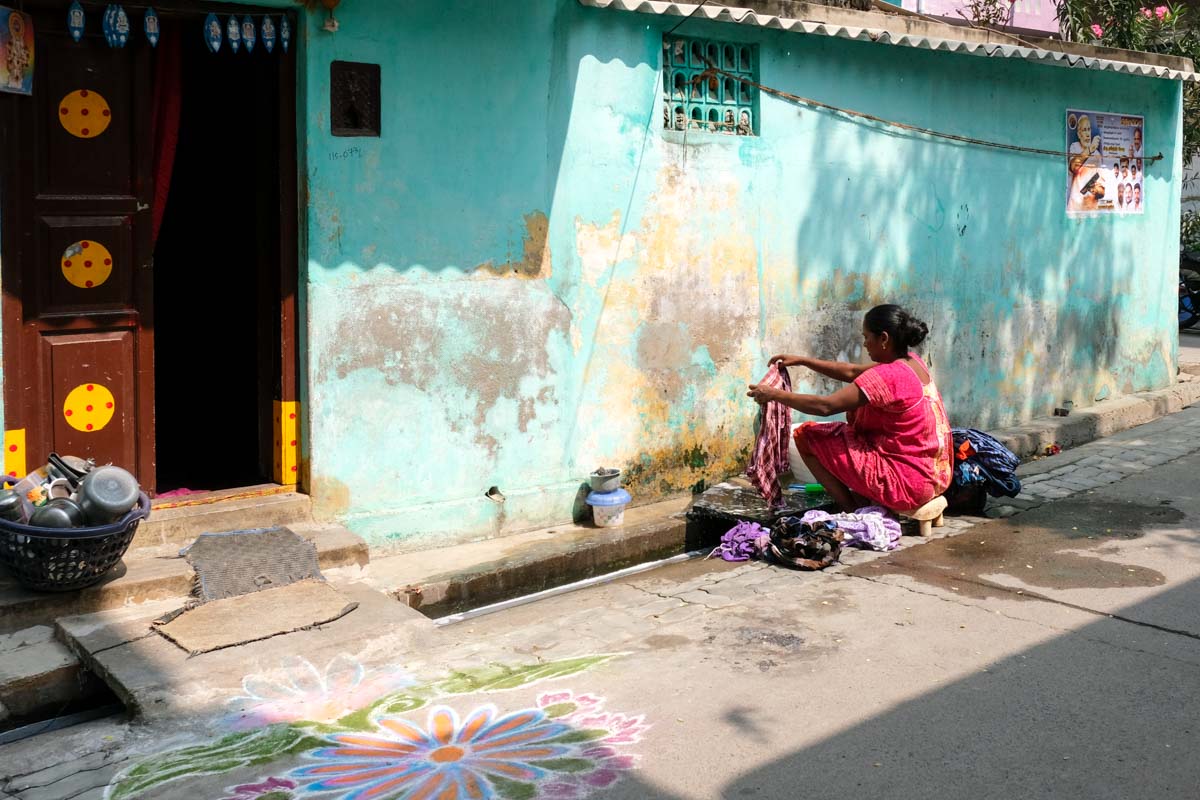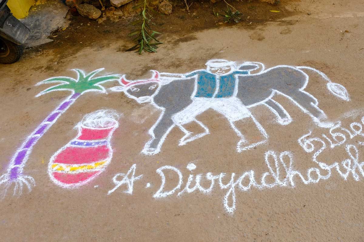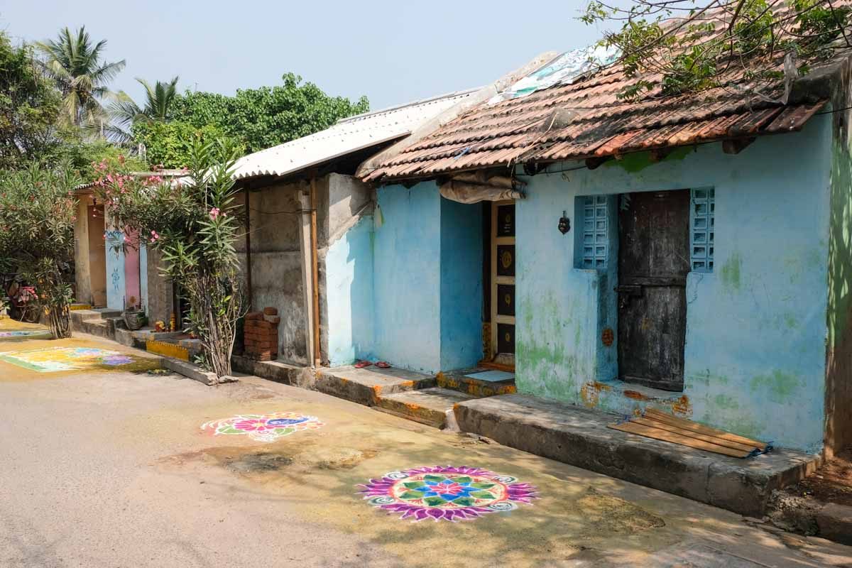 C’est bientôt la fête de Pongal et sur les seuils, devant les portes, les femmes ont dessiné des kolams (dessins à la craie et poudres colorées).