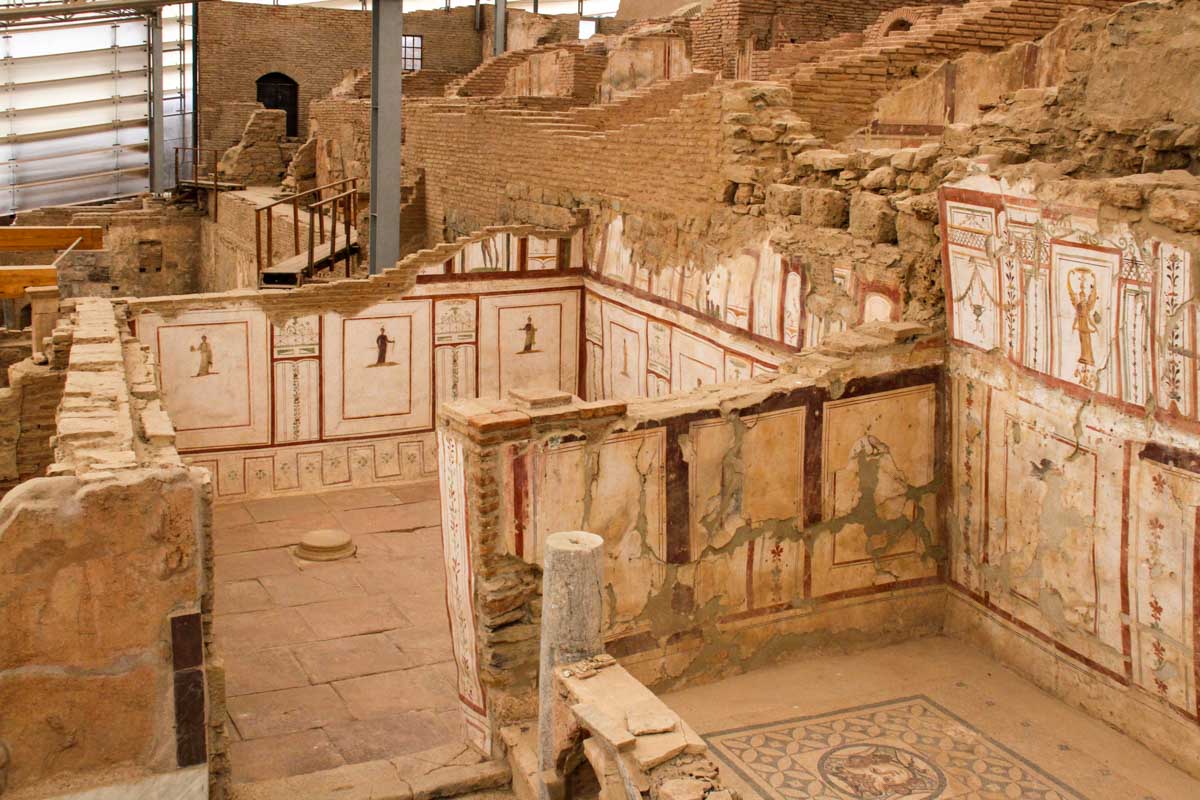 Elles sont protégées par un toit de toile. On se promène sur des passerelles de verre pour admirer les riches vestiges de six demeures patriciennes (mosaïques et peintures murales magnifiques) et assister au travail minutieux des archéologues.