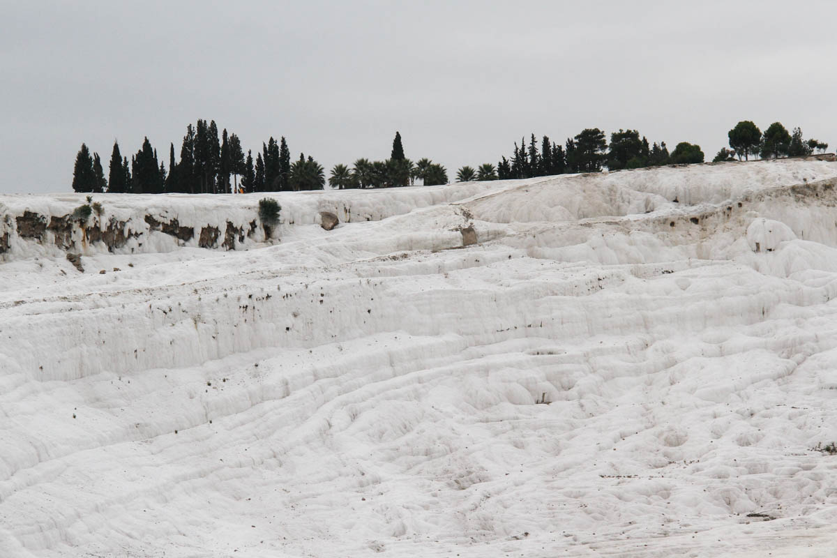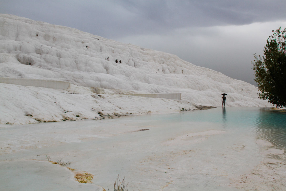 Nous traversons Aydin sous la pluie battante et nous arrivons à Pamukkale (en turc : le Château de Coton) vers midi.