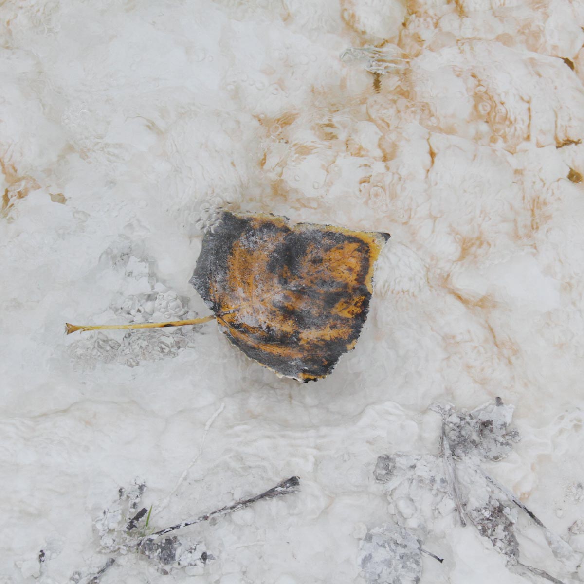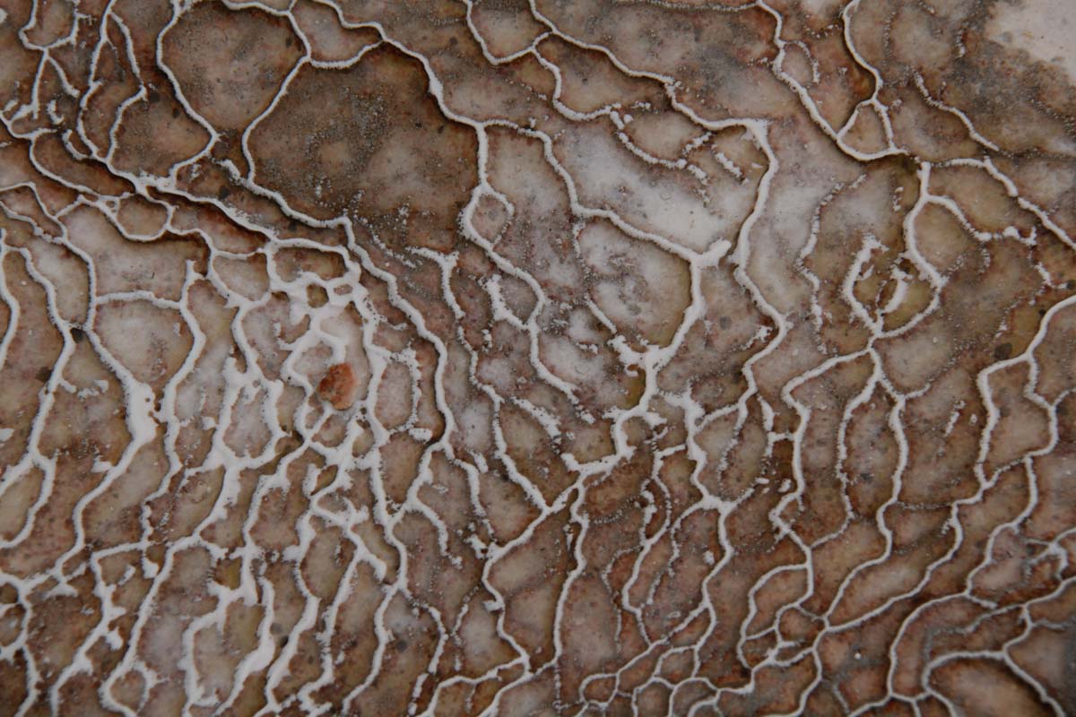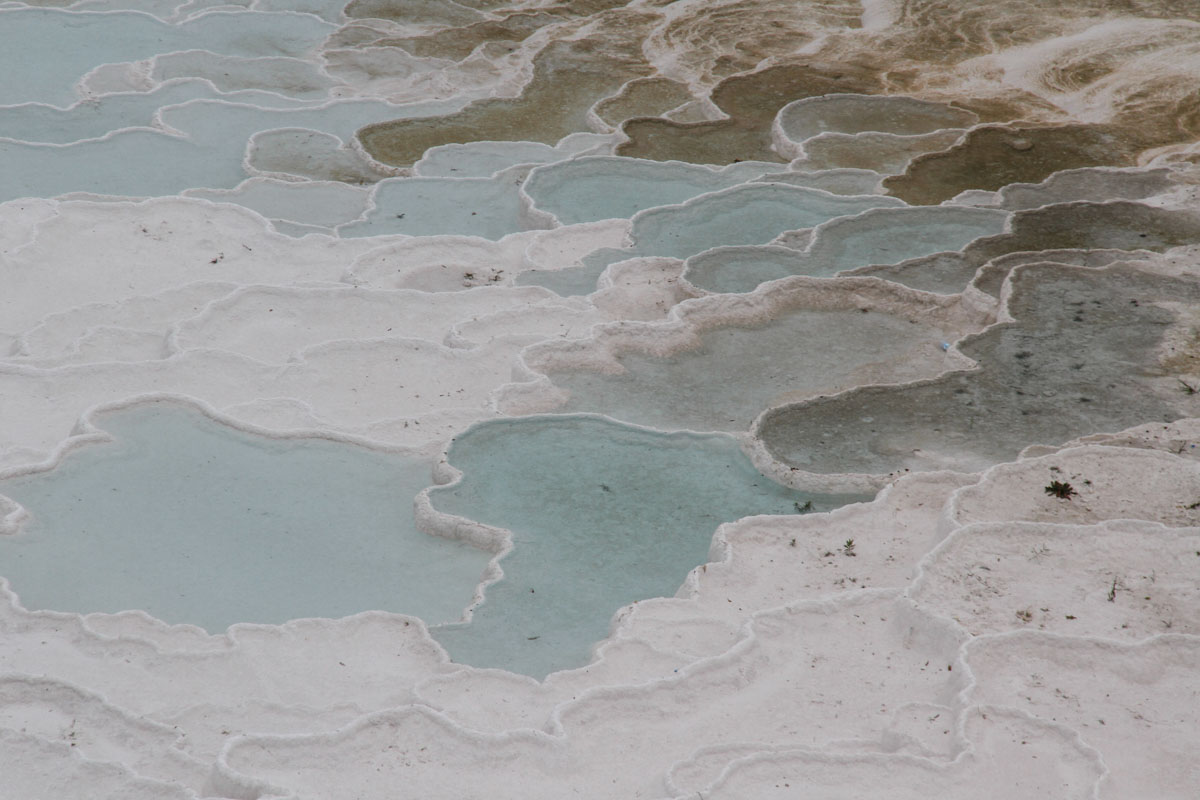 Pieds nus, nous gravissons les travertins (carbonate de calcium) formés par le ruissellement de l’eau provenant de sources chaudes chargées en calcaire.