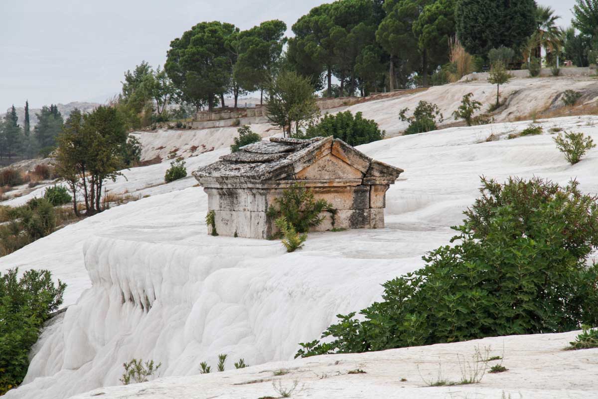 En se fossilisant, le calcaire recouvre la falaise de cascades blanches, formant des vasques et piscines naturelles et engloutissant même les vestiges de l’antique cité romaine de Hierapolis.