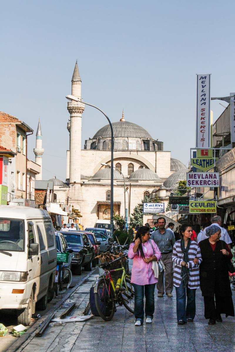 Une rue commerçante de Konya. On aperçoit la "Selimiye Camii," et le minaret du mausolée.