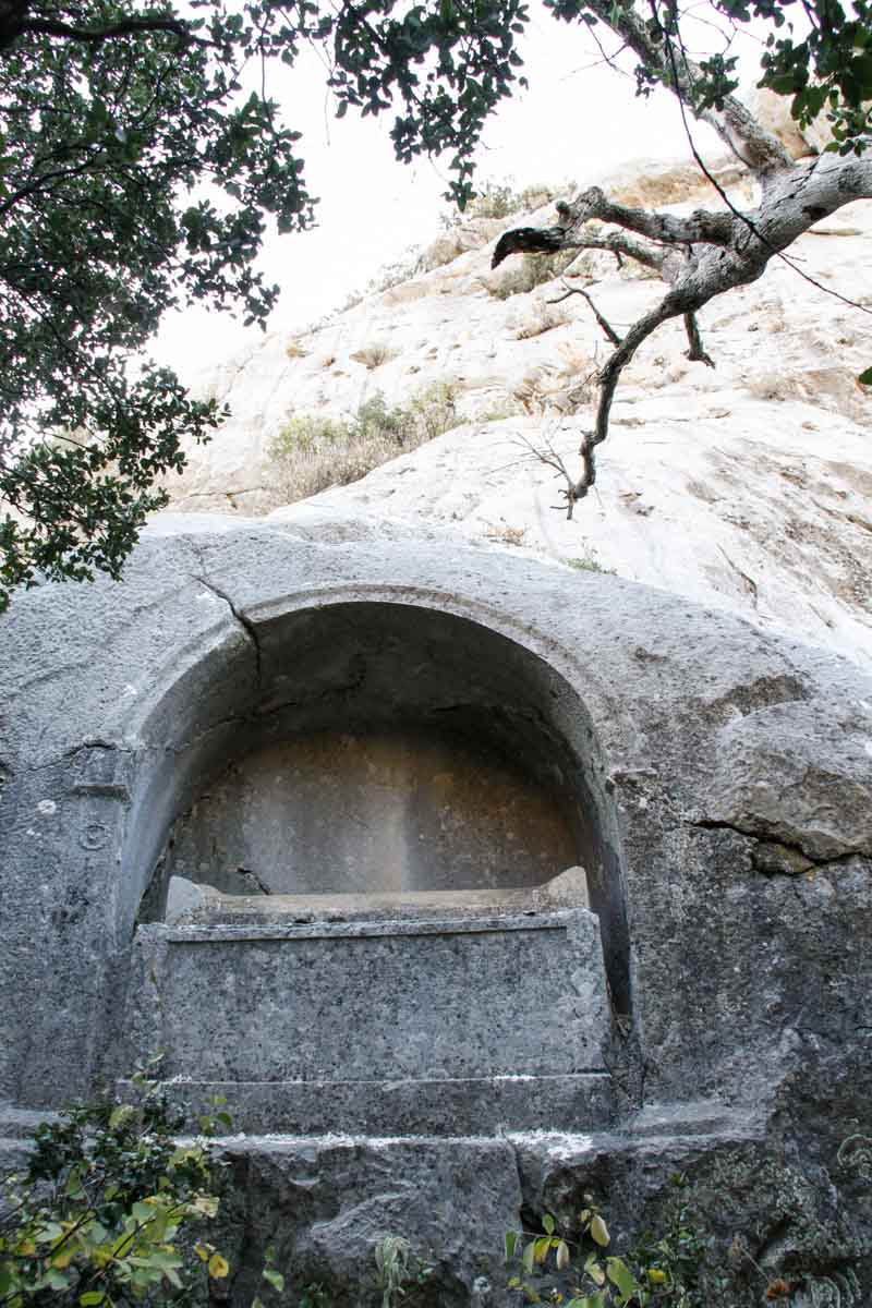 Pour visiter les vestiges de cette ville abandonnée depuis le Vème siècle, il faut crapahuter dans les rochers, à flanc de montagne.
