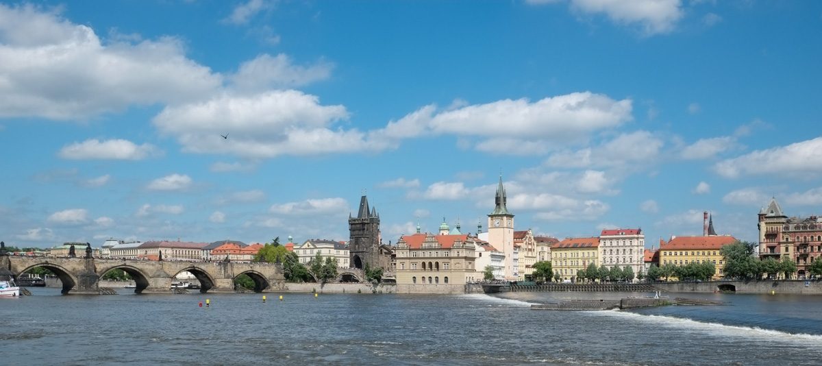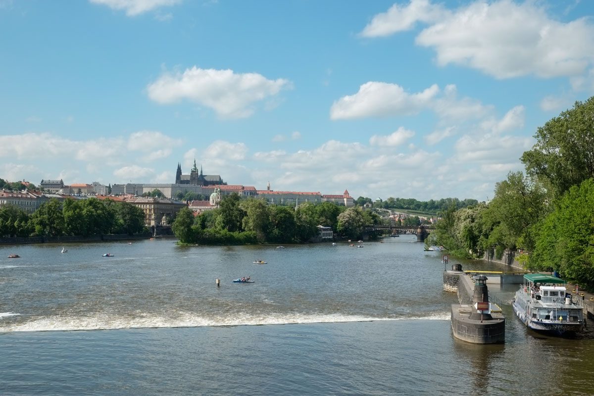 En longeant le bord de la rivière Vtlava, on arrive au pont Jiraskuv qui la traverse en face de la « Maison dansante ».