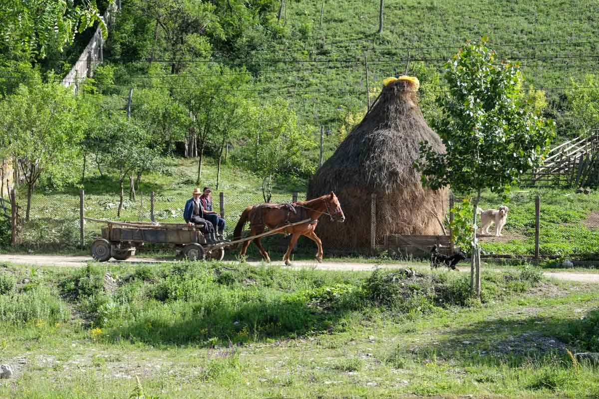 Une fois remontés au grand jour, en faisant un tour dans le village, nous rencontrons une dame qui garde ses vaches et qui essaie de discuter un peu avec nous mais notre pratique du roumain se résume aux formules de politesse… Un monsieur sur sa charrette à cheval la rejoint.