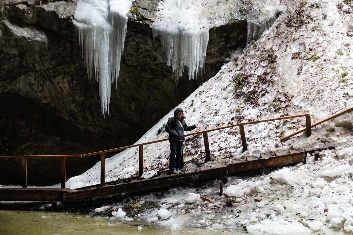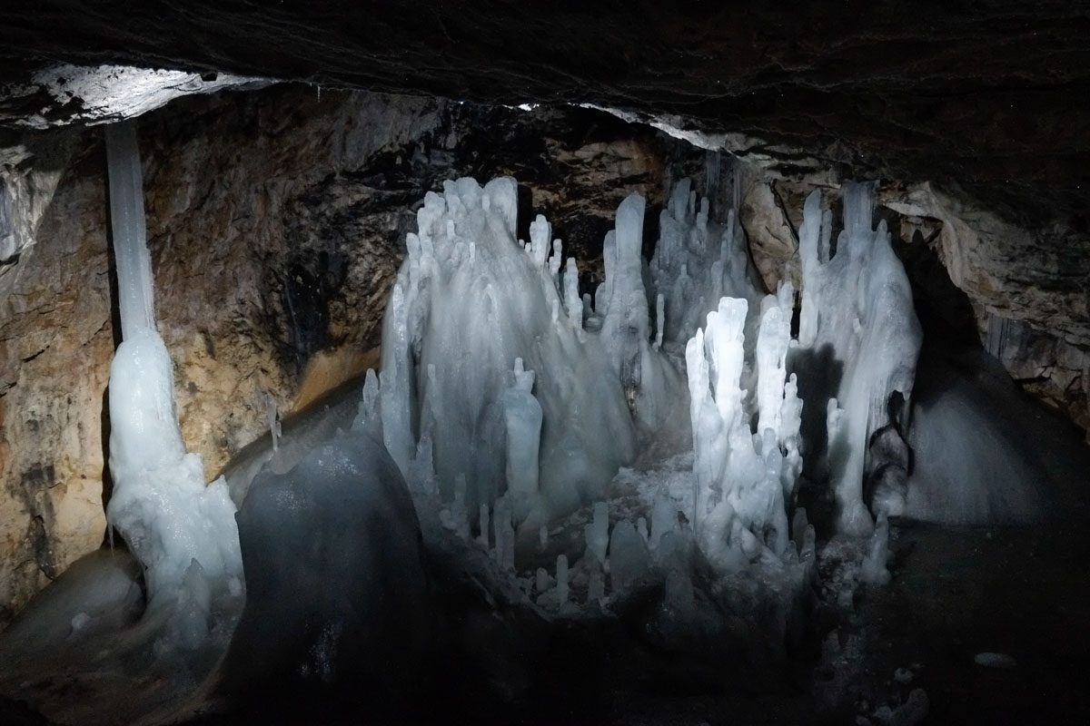 En bas, il fait plutôt froid. On y trouve un gros amas de neige durcie puis, c’est le glacier (âgé de 3800 ans). Sur des passerelles en bois, nous cheminons le long du glacier souterrain jusqu’à une cavité où se sont formées des stalagmites de glace.