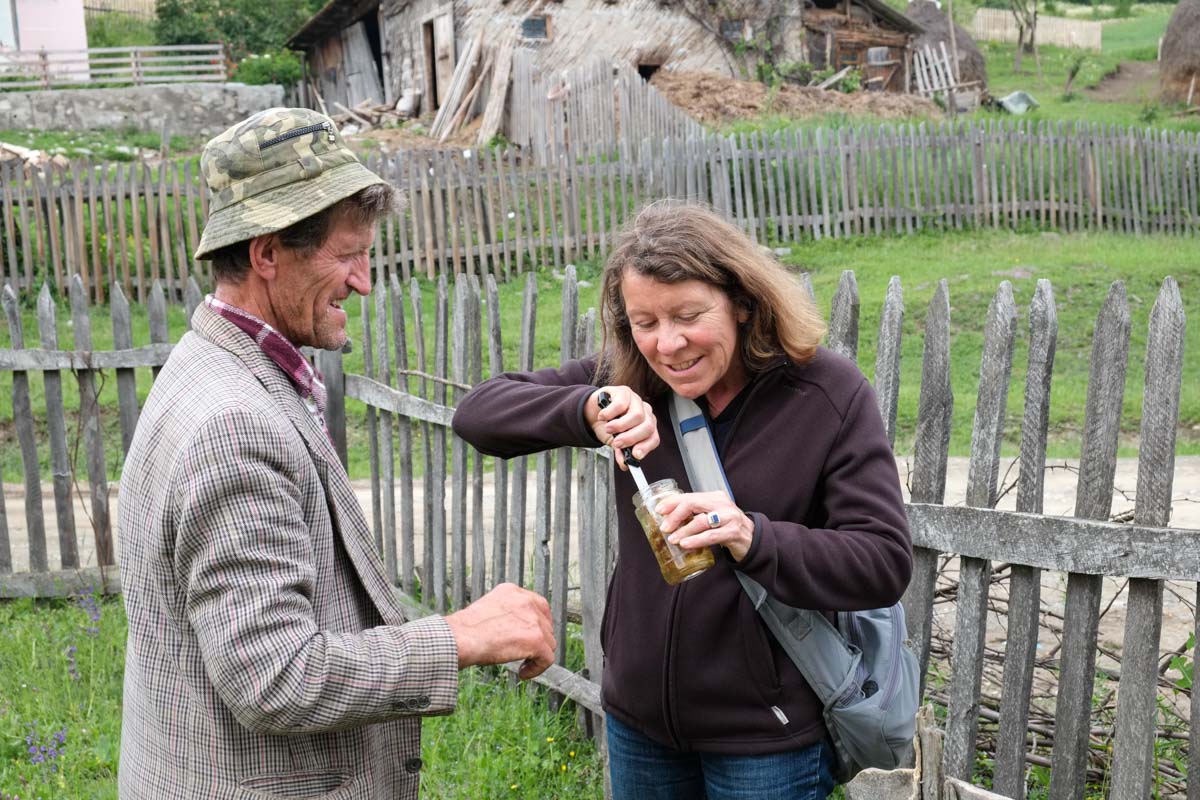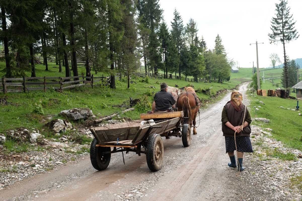 Une fois remontés au grand jour, en faisant un tour dans le village, nous rencontrons une dame qui garde ses vaches et qui essaie de discuter un peu avec nous mais notre pratique du roumain se résume aux formules de politesse… Un monsieur sur sa charrette à cheval la rejoint.