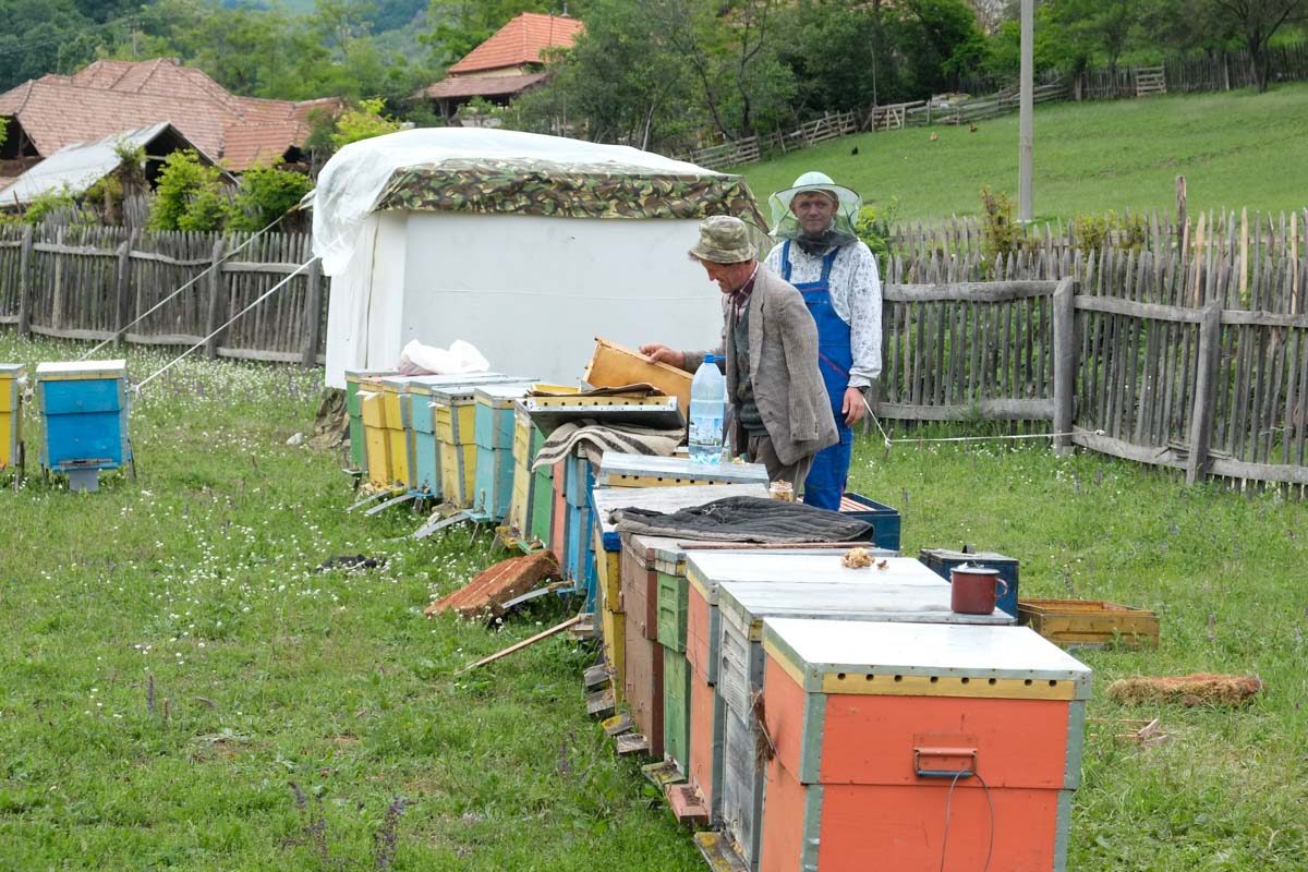 Un monsieur est en train de nettoyer ses ruches, il me fait gentiment goûter un peu de miel…