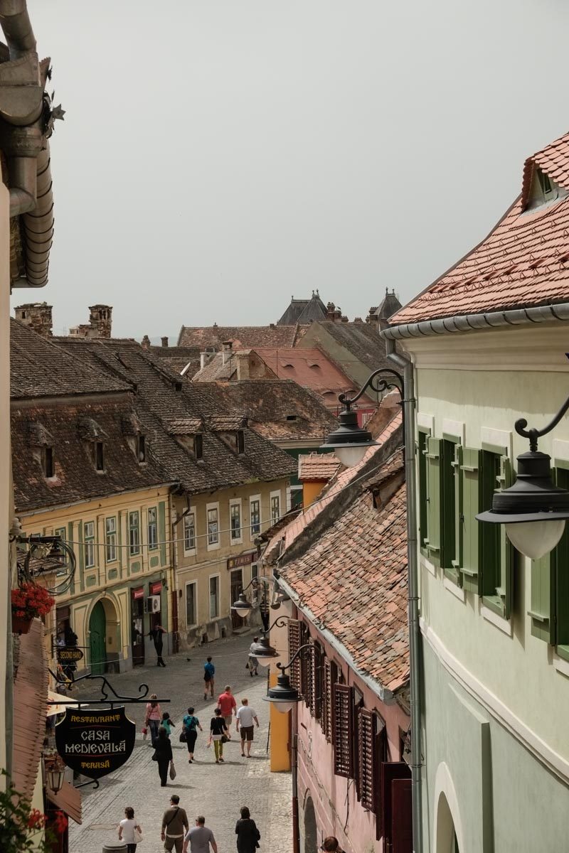 Les trois belles places, Piata Mare, Piata Mica et Huet, donnant les unes dans les autres, les vieilles maisons à arcades, aux toits garnis de lucarnes comme des yeux de chats qui vous surveillent sans en avoir l’air, les escaliers anciens et les rues pavées forment un ensemble plein de charme.