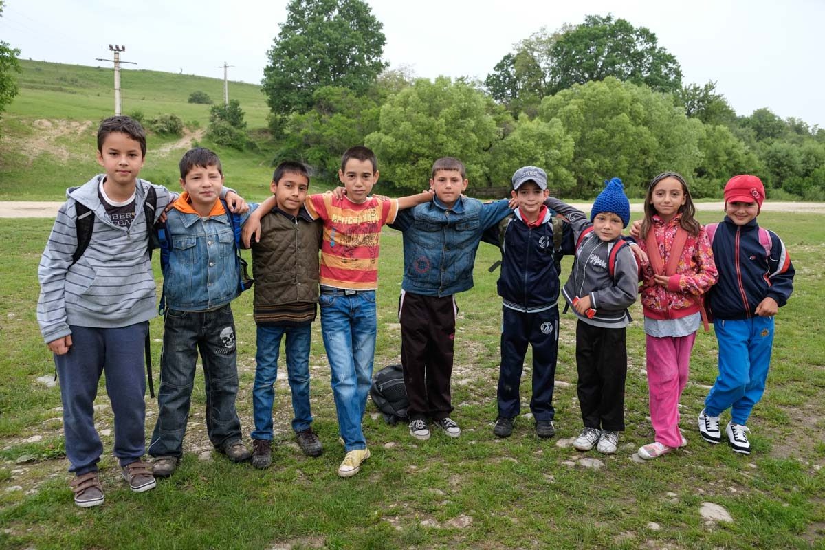 Nous sommes garés tout près de l’endroit où le bus vient chercher les enfants pour les emmener à l’école. Bientôt, nous sommes environnés d’enfants, très curieux de voir notre « roulotta ».
