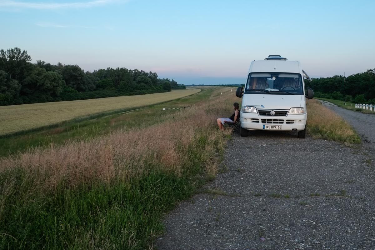 Il faut maintenant chercher un endroit pour passer la nuit et nous trouvons un terre-plein près de l’embarcadère d’un bac sur la rivière Szamos, au bout d’une petite route défoncée.