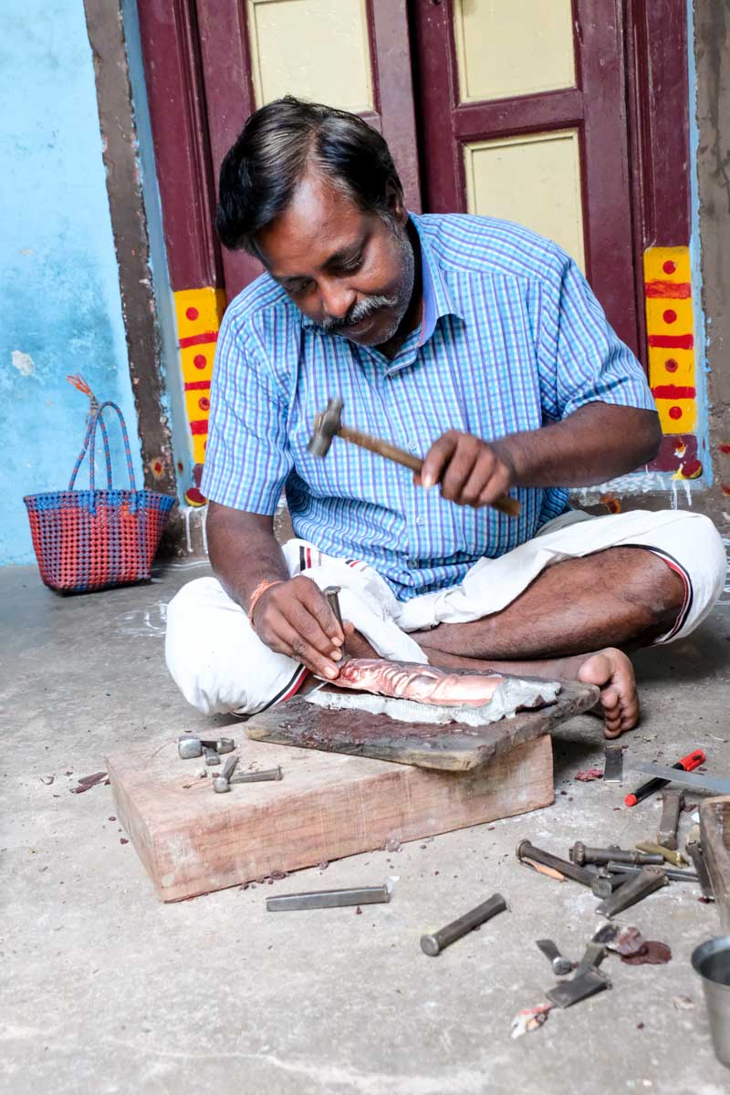 Dans une ruelle minuscule, un sculpteur sur cuivre