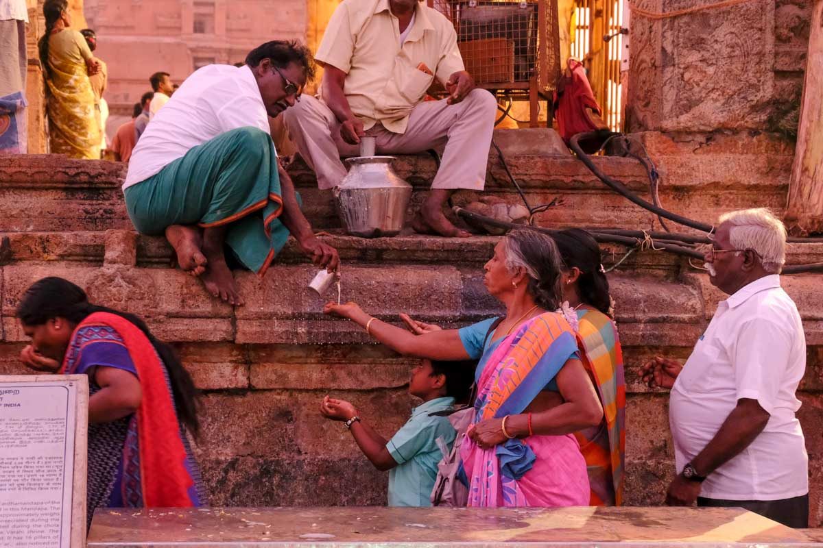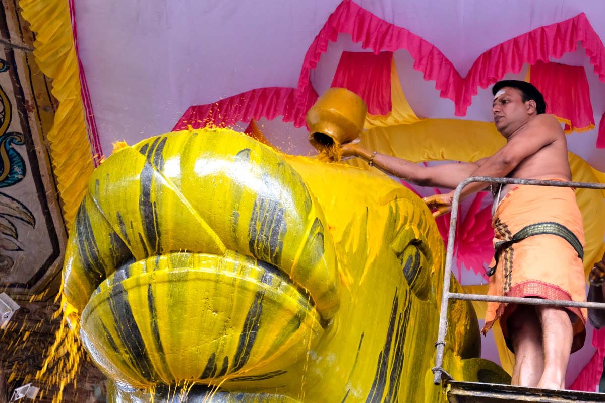 En effet, voilà la puja qui commence, comme nous avions vu à Kumbakonam avec du lait et du riz, mais dans une autre dimension, cette fois !