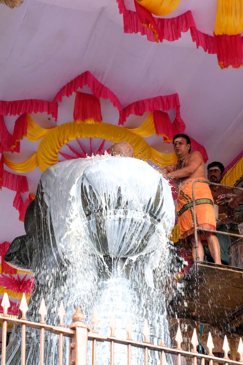 Ce sont des seaux entiers de lait, de riz au lait et d’eau qui sont versés sur la tête du Nandi ! C’est encore Pongal, aujourd’hui !!!