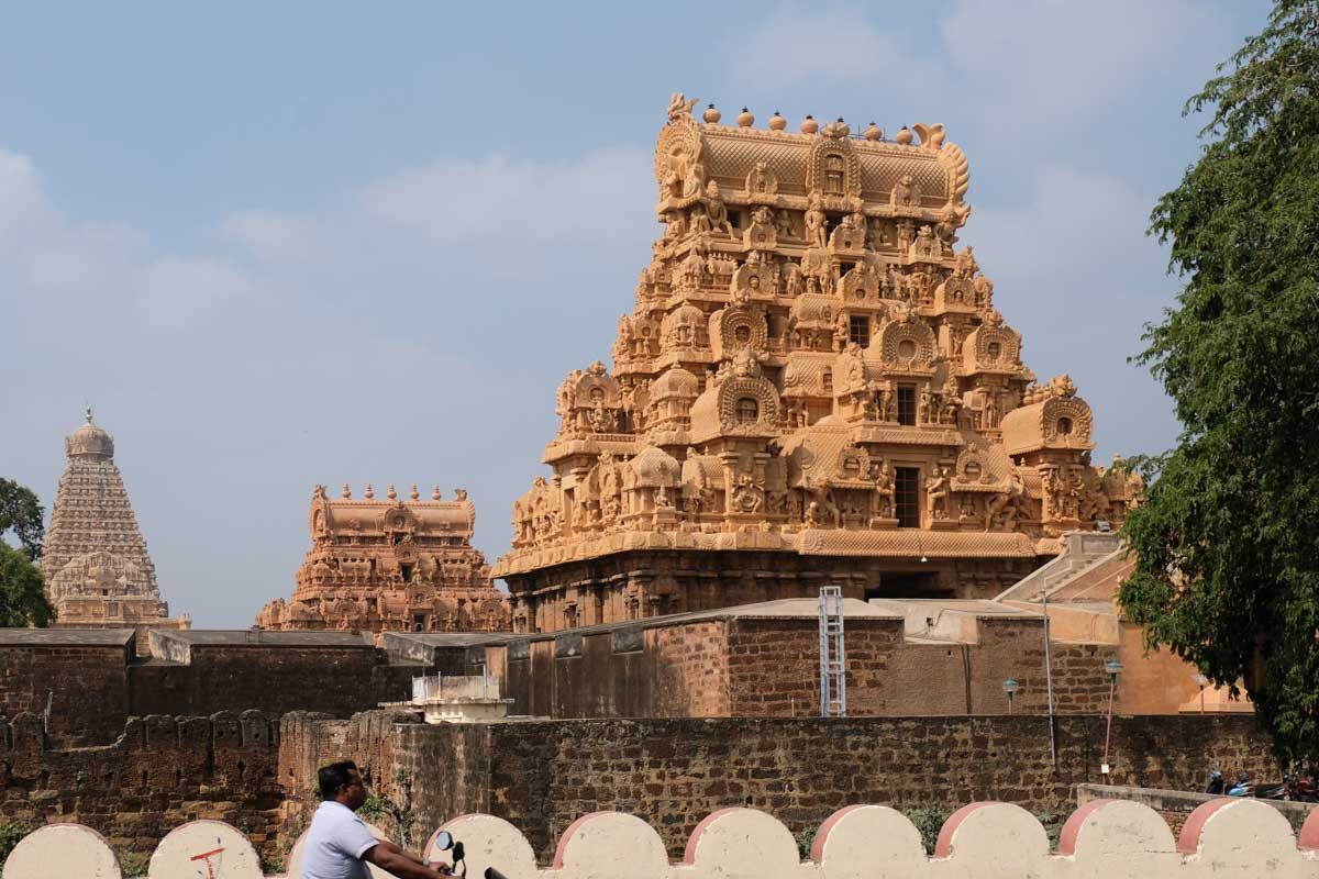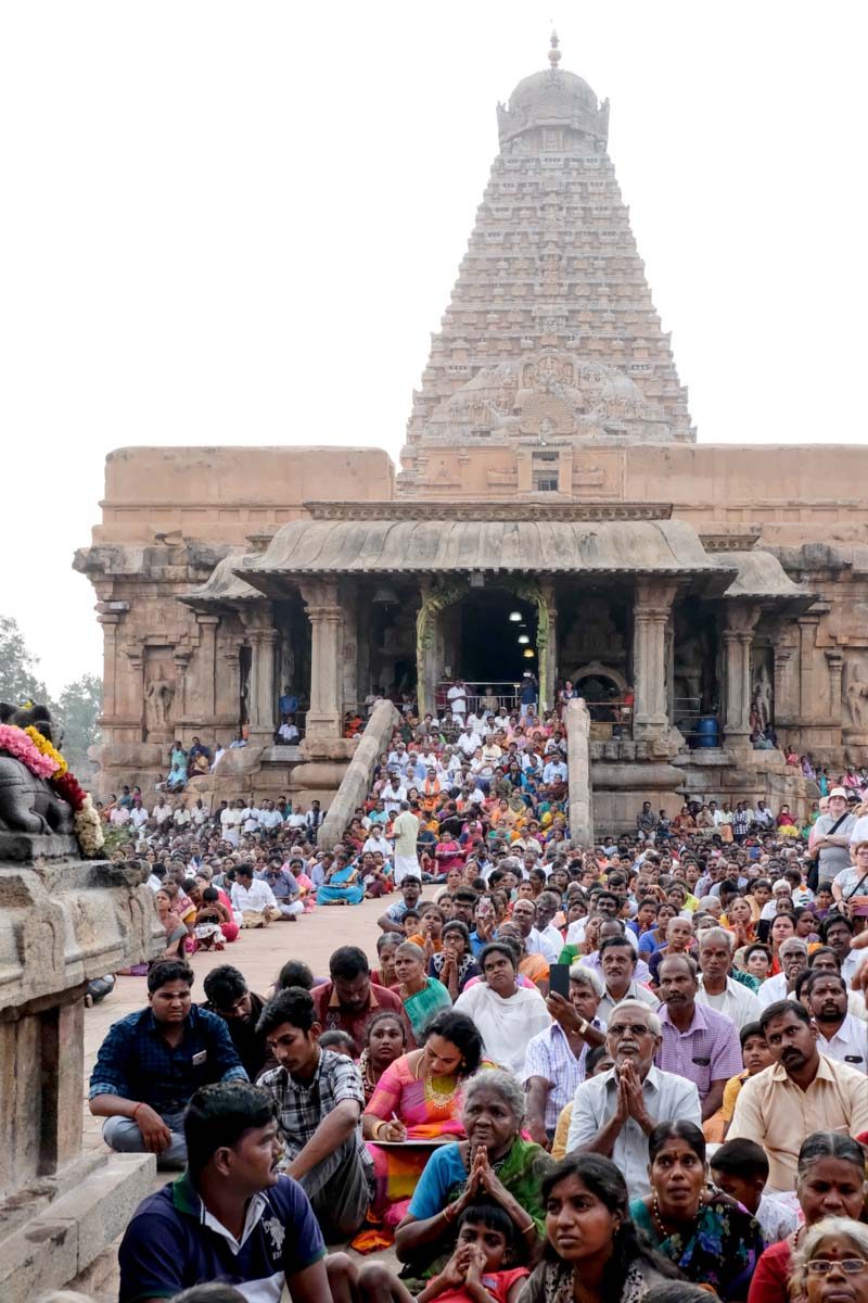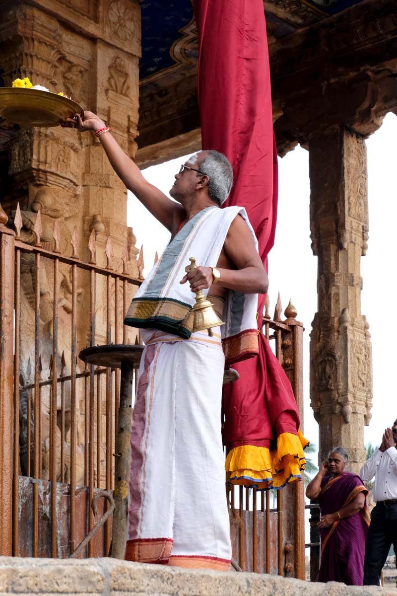 Nous arrivons au grand et célèbre temple de Brihadishwara. A peine entrés dans l’enceinte, nous apercevons les préparatifs : des échafaudages sont montés près de l’énorme statue de Nandi.