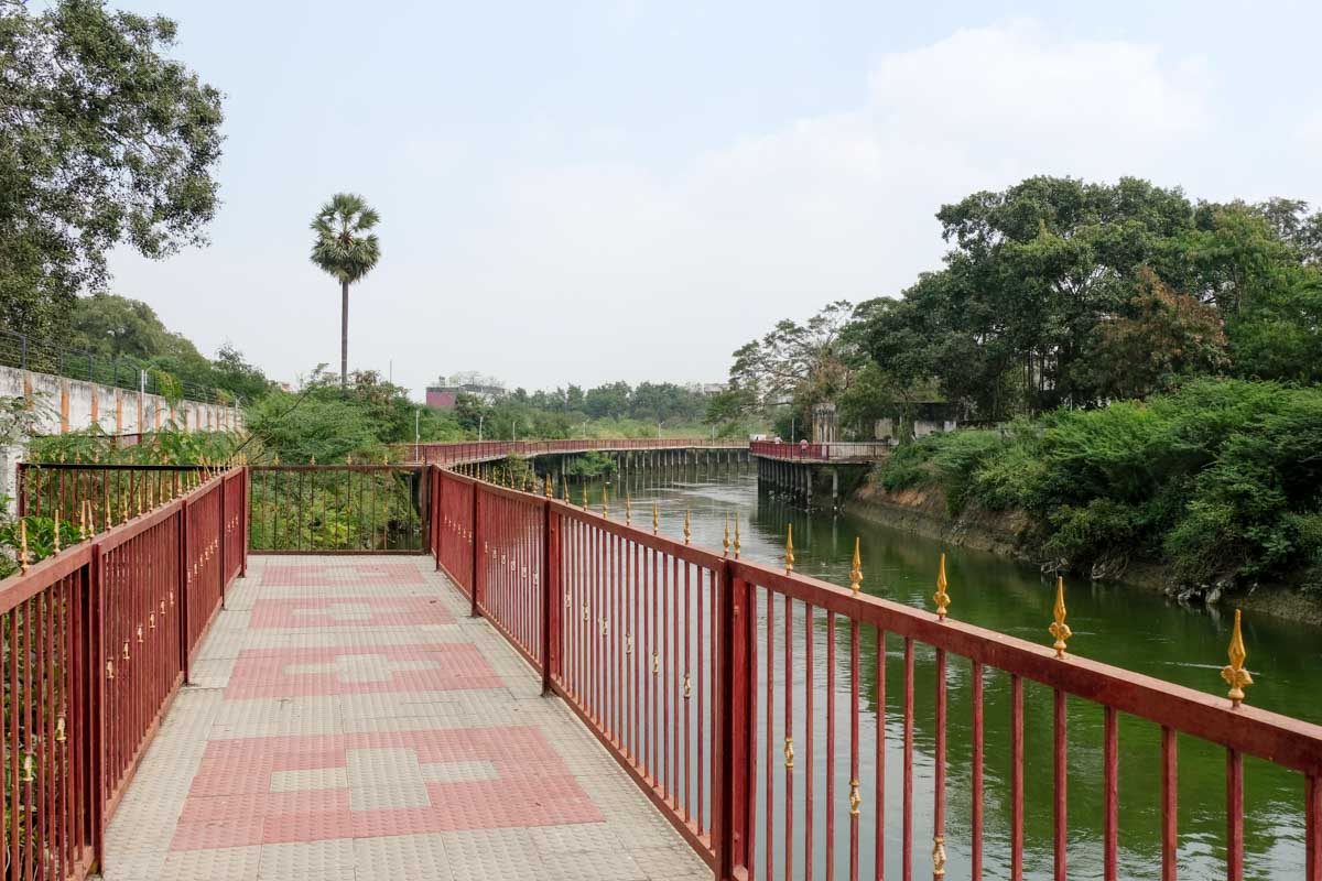 Pour aller en ville, il y a un sentier piétonnier dallé qui longe les deux côtés du canal. Il mène au pont et à la grande artère qui rejoint Old bus stand, quartier où se trouvent tous les restos.