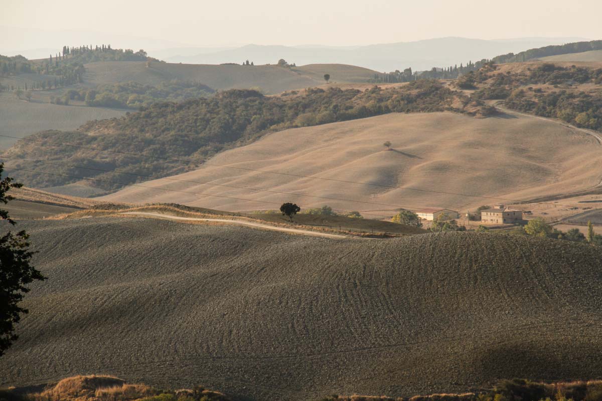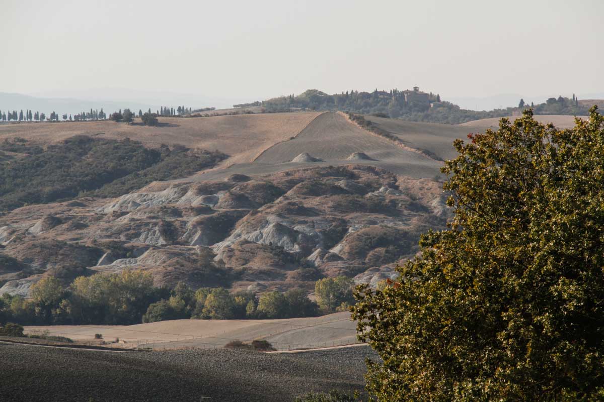 Ensuite, nous partons pour Pienza, située dans le Val d’Orcia. C’est la saison des labours d’automne, tous les champs sont retournés et la terre beige clair, vert pâle, presque blanche, offre des nuances subtiles…
