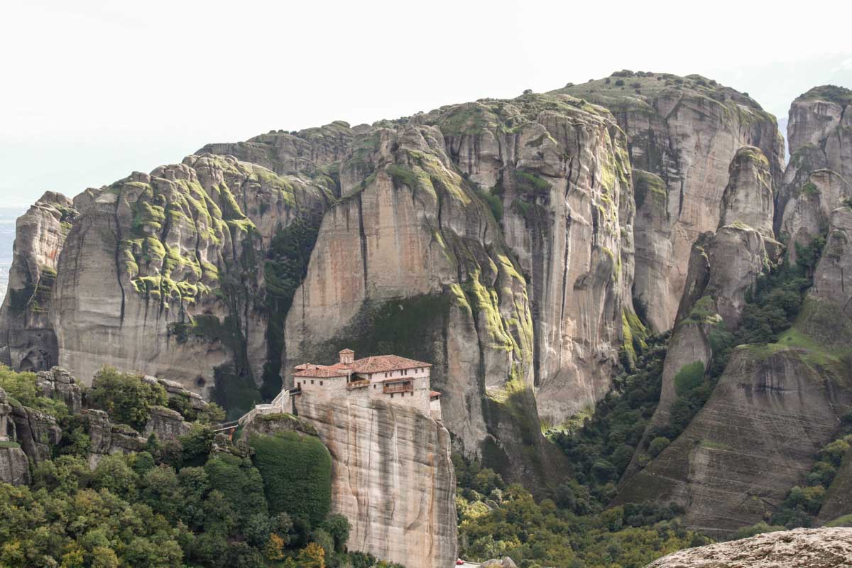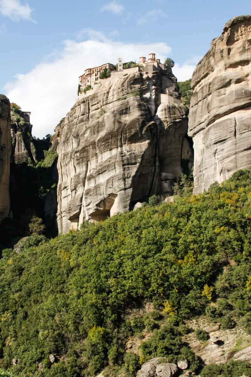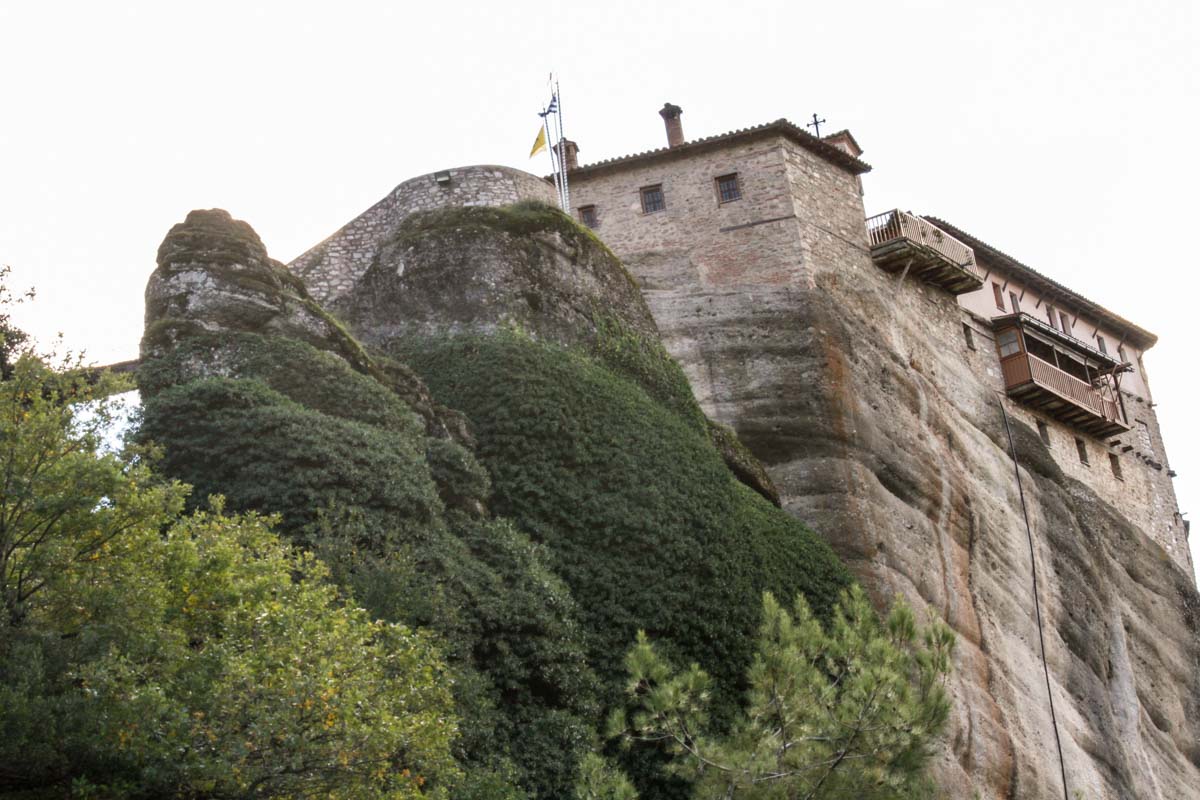 Bientôt, nous apercevons le premier monastère, St Nicolas d’Anapafsas, perché sur son rocher, puis celui de Roussanou, relié à la terre par des passerelles au-dessus du vide.