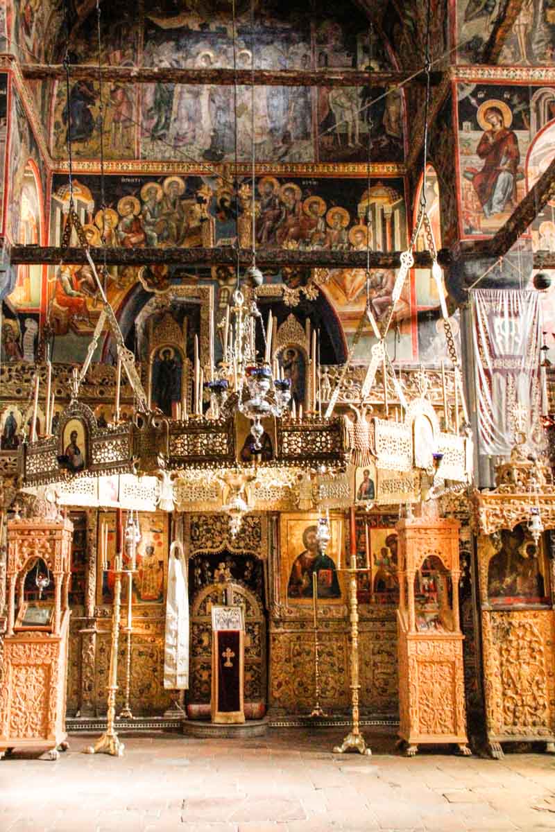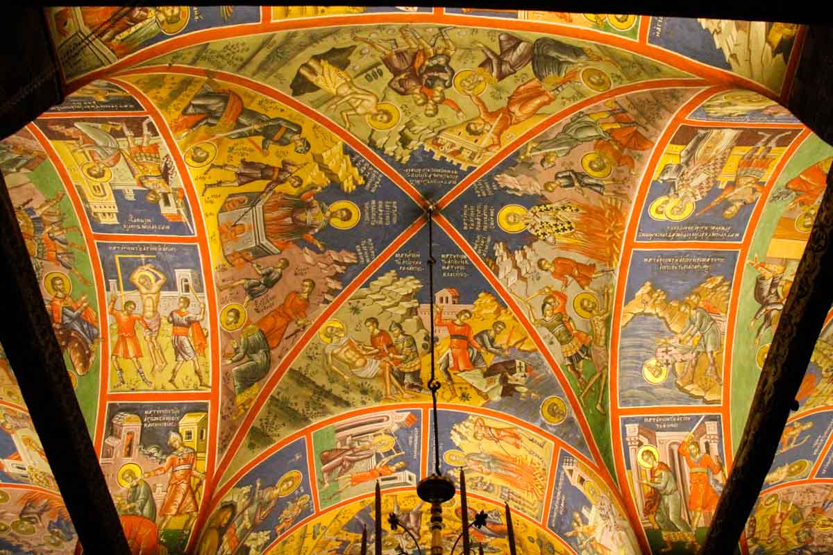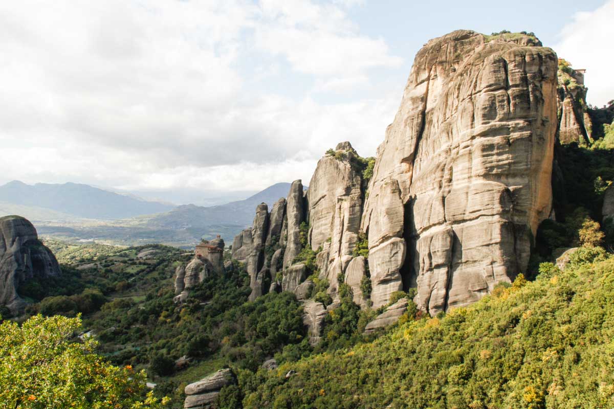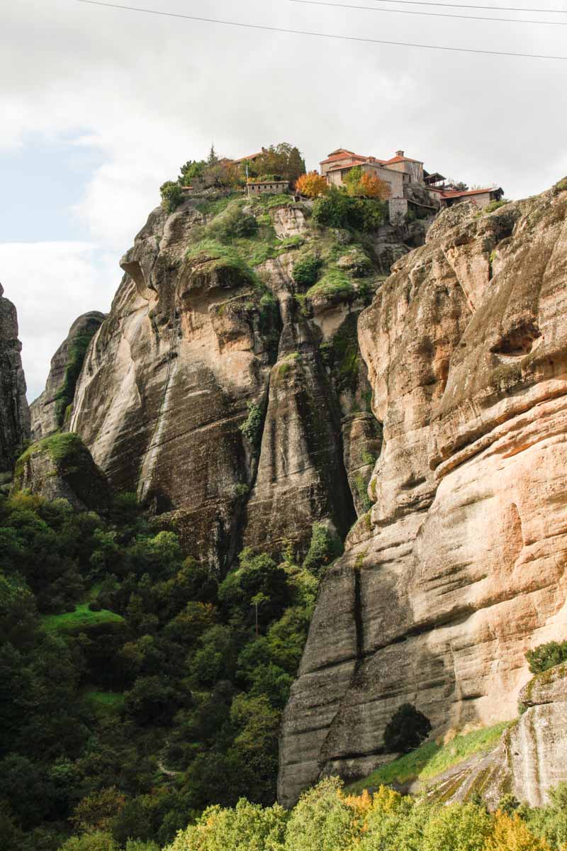 Bientôt, nous apercevons le premier monastère, St Nicolas d’Anapafsas, perché sur son rocher, puis celui de Roussanou, relié à la terre par des passerelles au-dessus du vide.