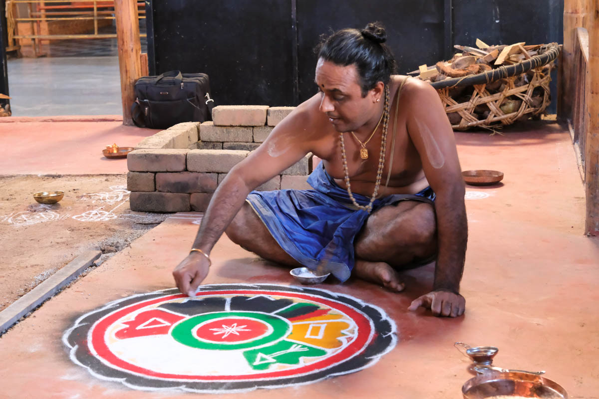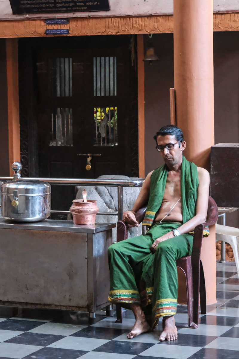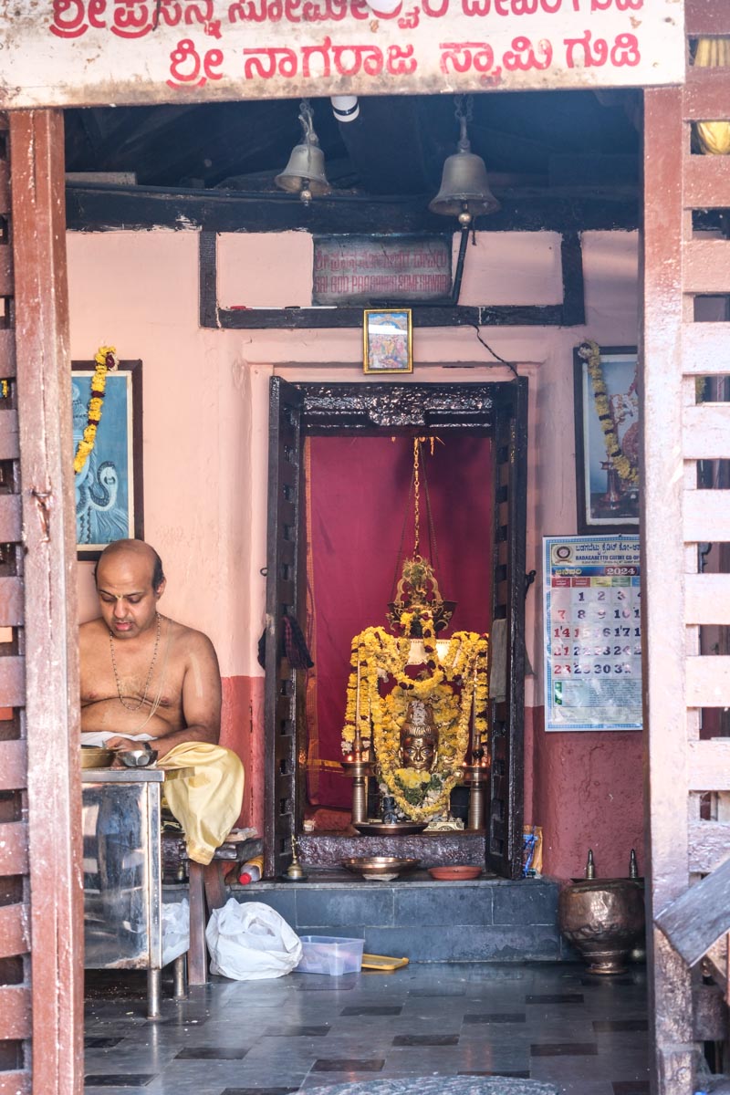 Dans l'enceinte du temple de Shiva, un sanctuaire et son prêtre