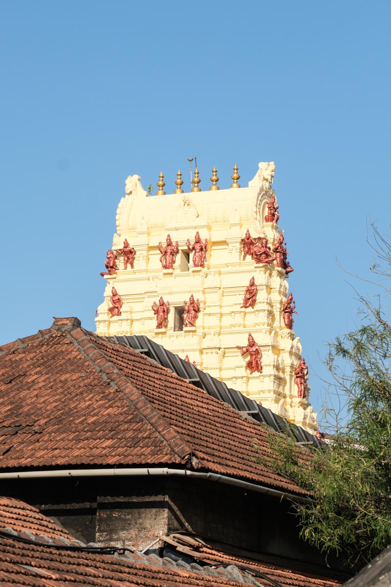 Au-dessus des toits du temple de Shiva, émerge le gopuram du temple de Krishna