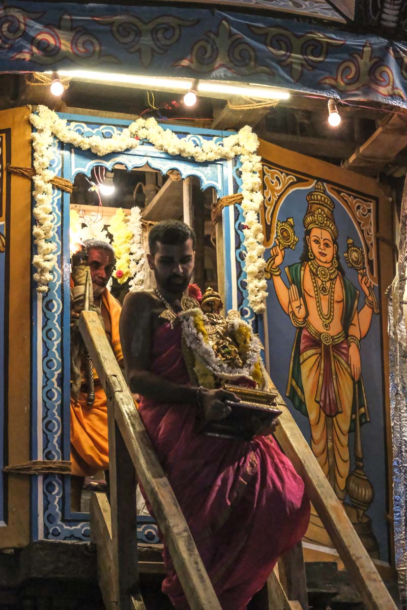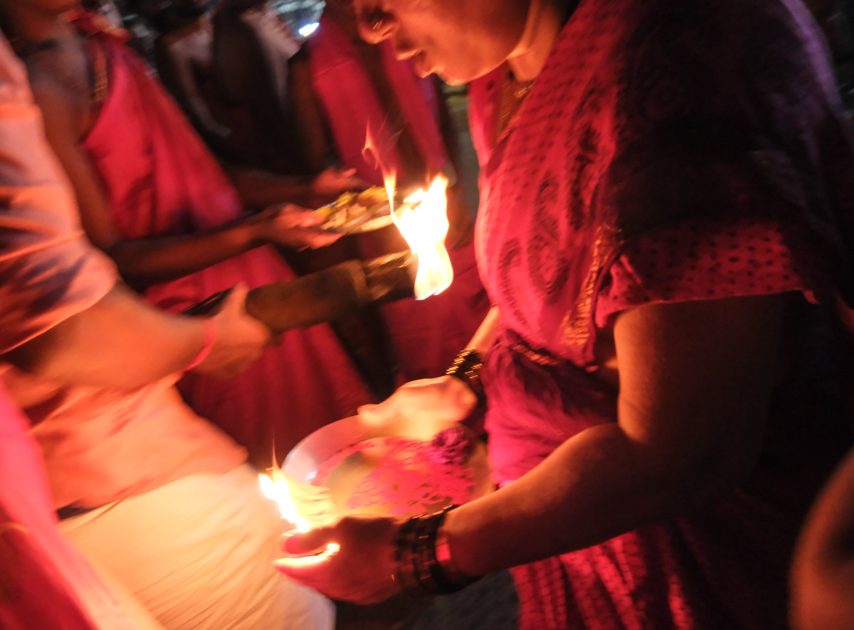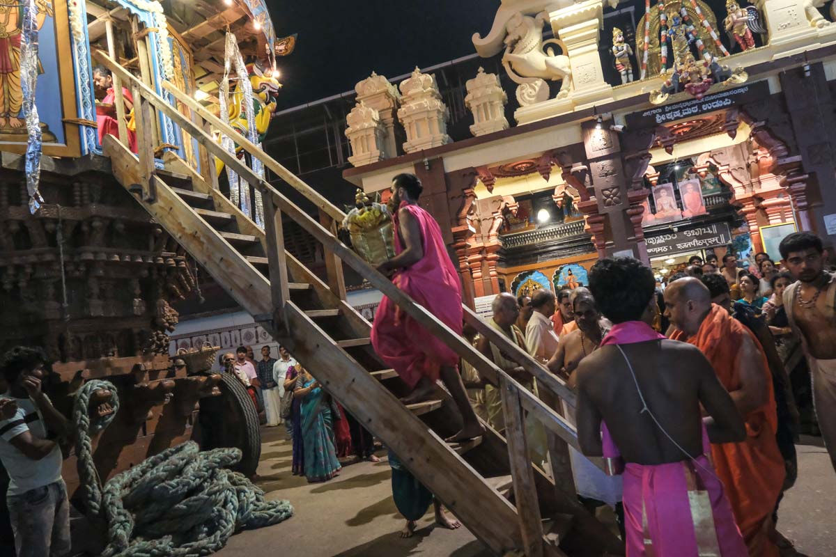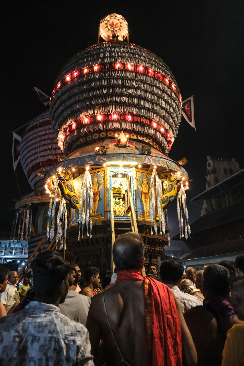 Vers 19h30, nous retournons au temple … Tout le monde attend la sortie des idoles et la mise en mouvement du char, désormais tout illuminé …