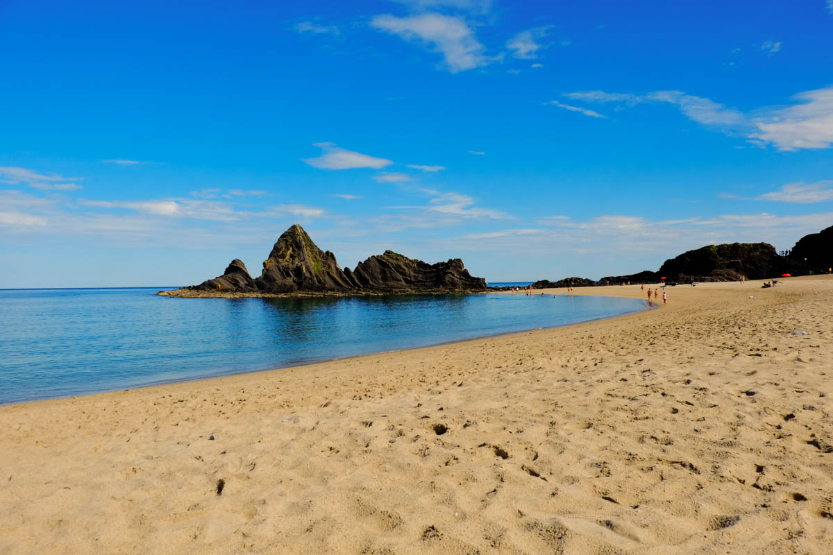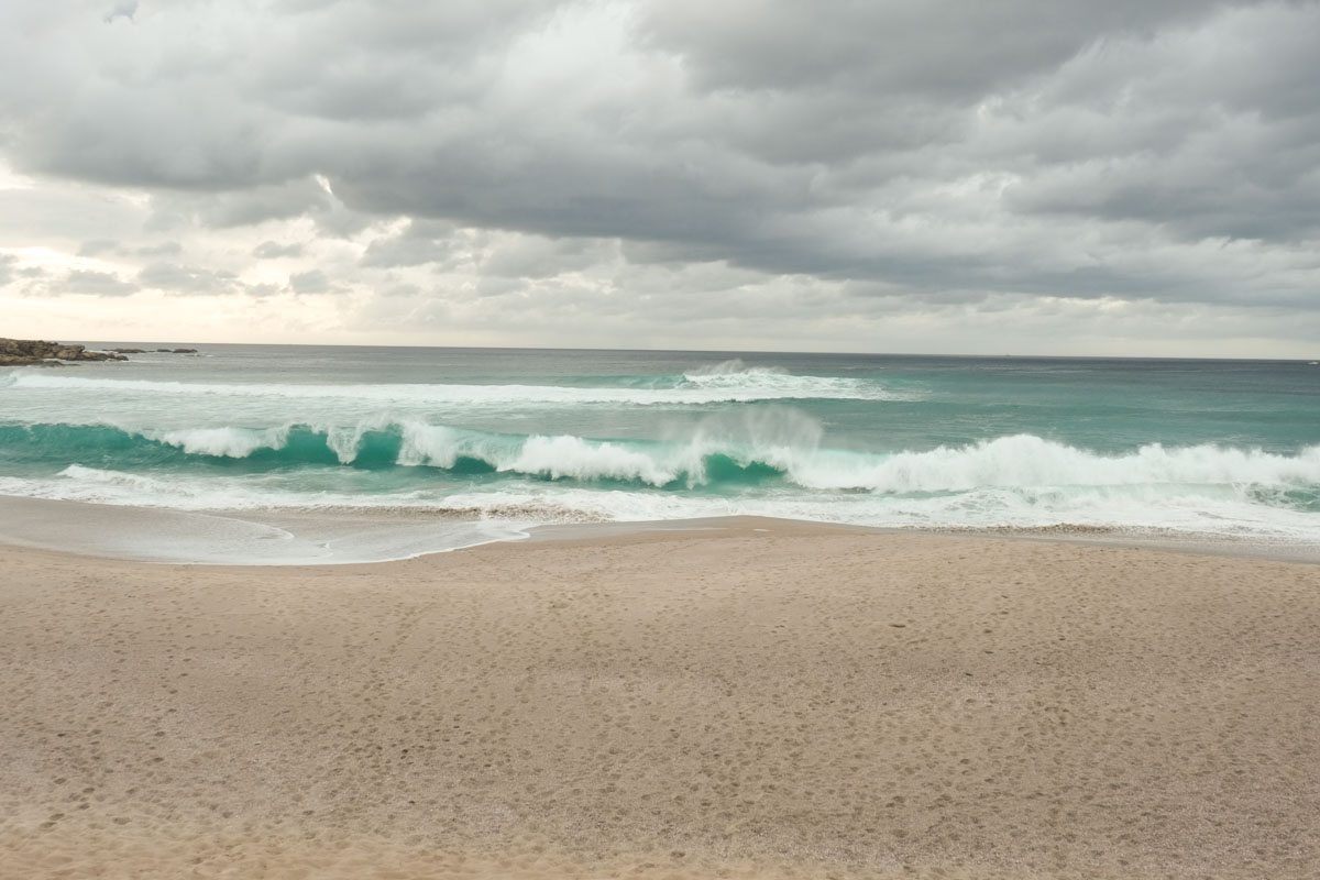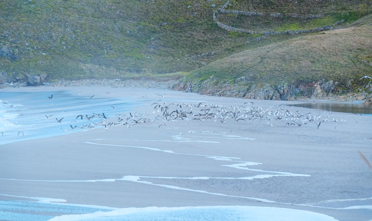 Il y a beaucoup de vent et de gros rouleaux agitent la mer d’un vert de jade. La plage, très sauvage, est encadrée de dunes et de collines.