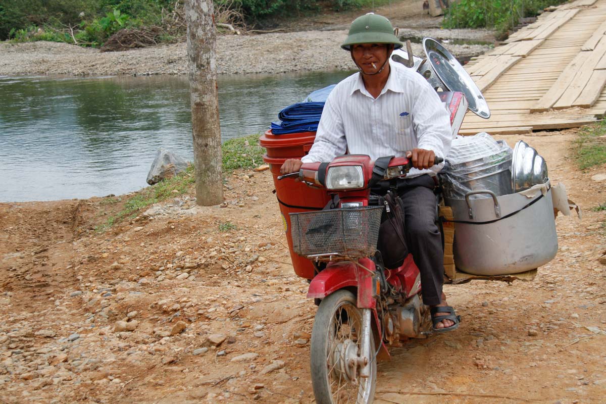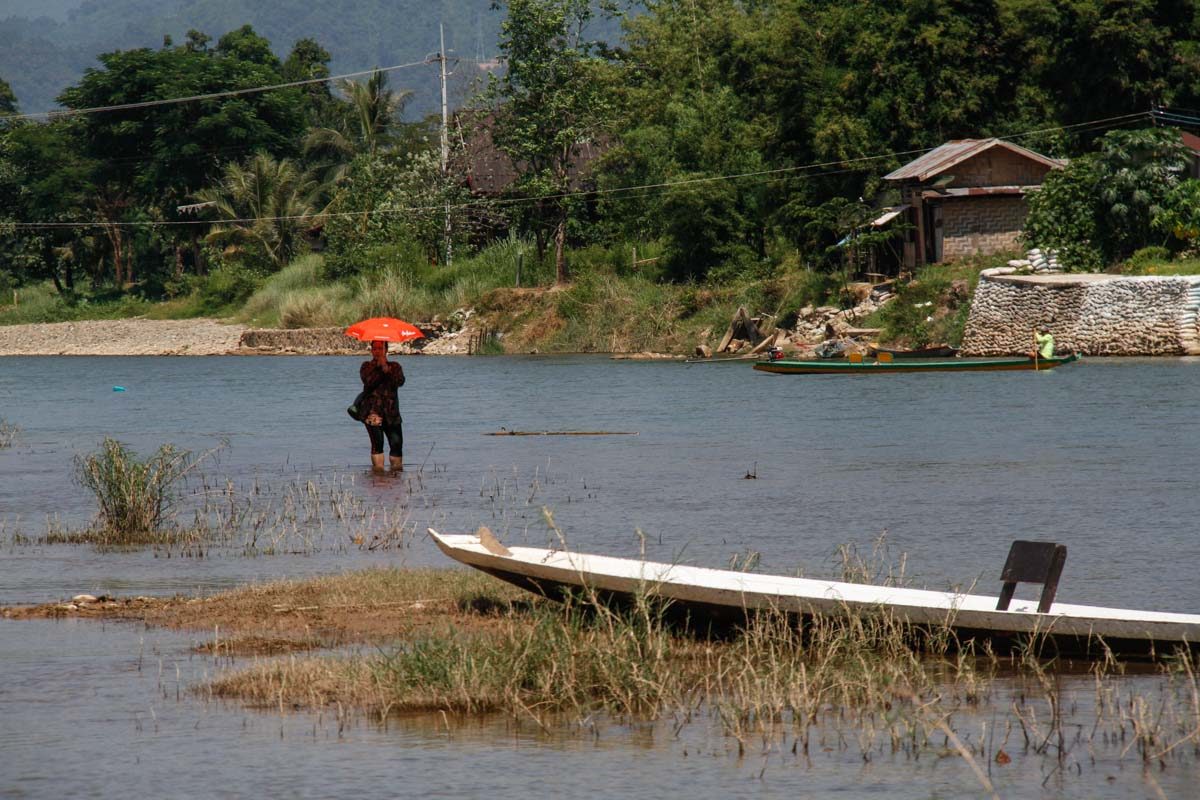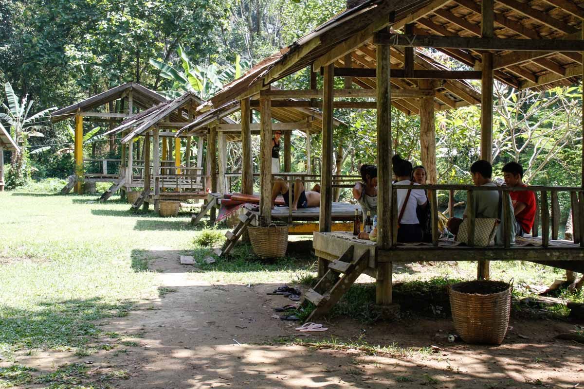 L’eau est trop haute en ce moment et nous devons rebrousser chemin. En saison sèche, une passerelle en bambou gratuite enjambe la rivière et ces guesthouses doivent être alors accessibles, et très agréables.
