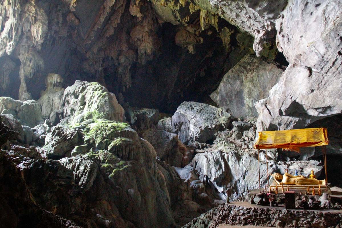 Après bain et repos, il n’y a plus qu’à grimper dans la colline derrière jusqu’à une grotte aux belles concrétions abritant un bouddha couché.