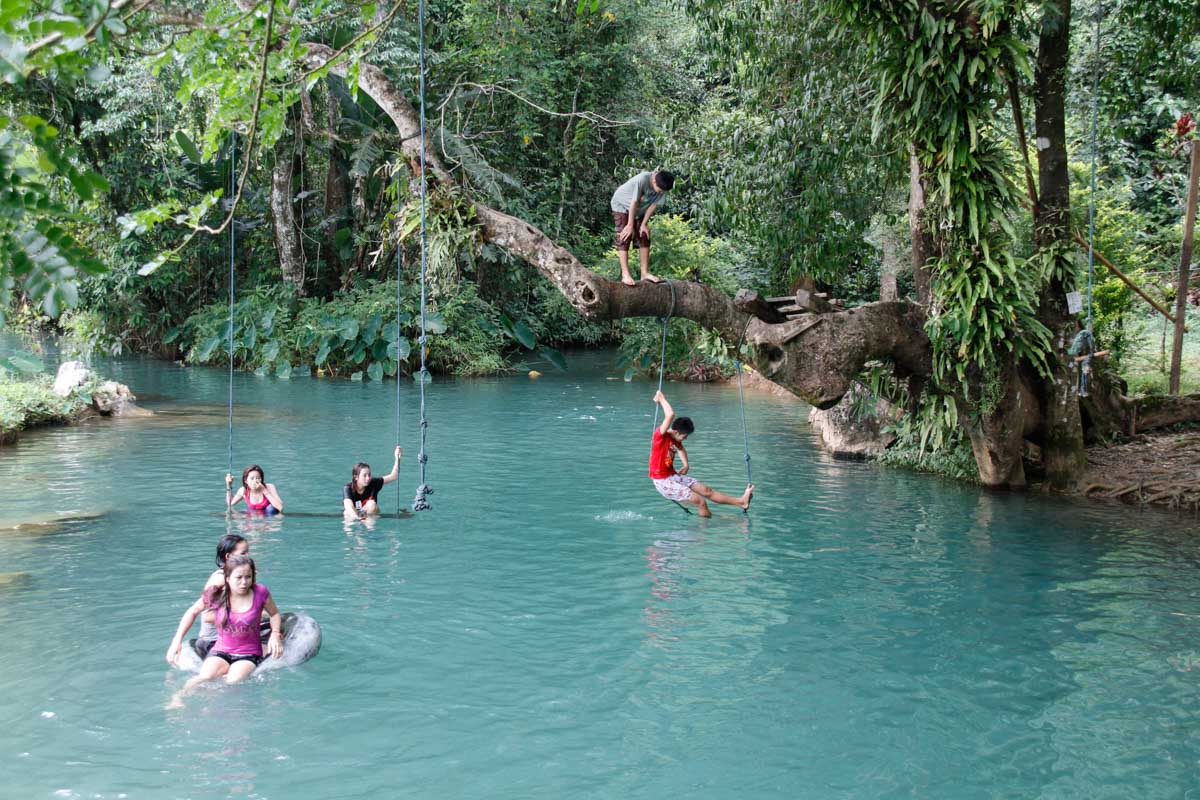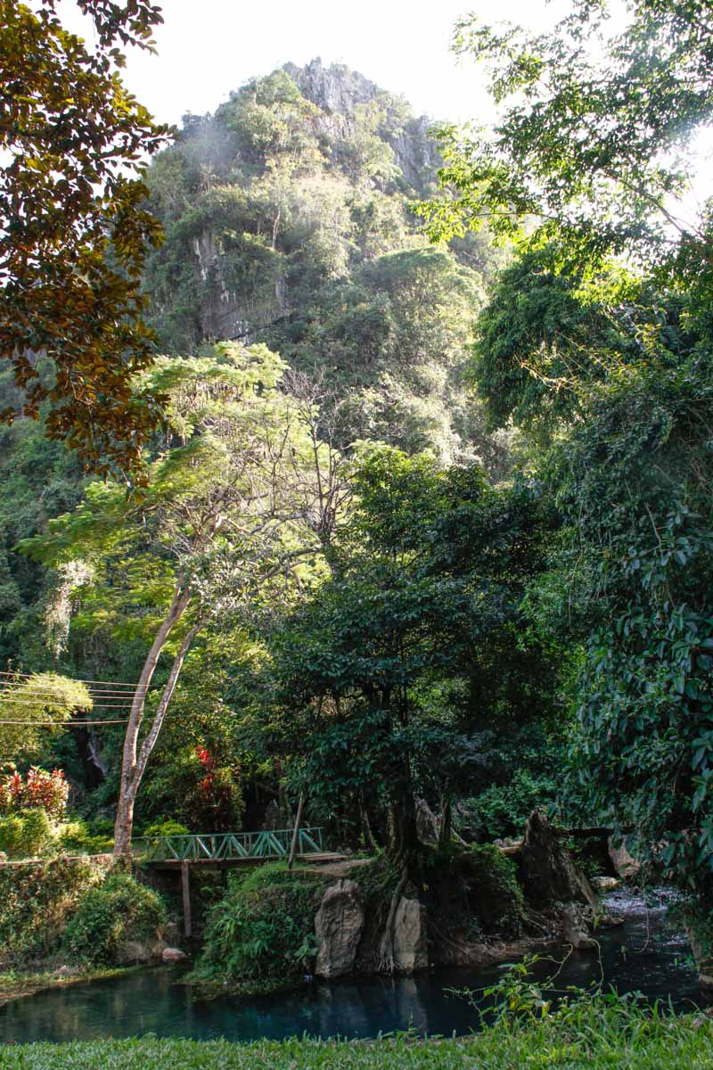 Après paiement d’un droit d’entrée, on peut traverser le parc et accéder aux grottes. Une petite rivière coule entre les roches et forme un minuscule lagon. L’eau y est bien fraîche et on peut nager sous la grotte dans des boyaux sombres et étroits ! Ouh…