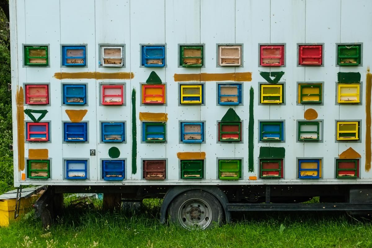 Très souvent, dans les champs, on peut voir des camions rempli de cases colorés : ce sont des ruches !