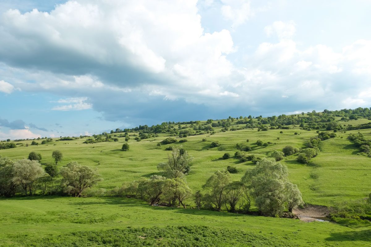 Paysage de douces collines piquetées çà et là de bouquets d’arbres…