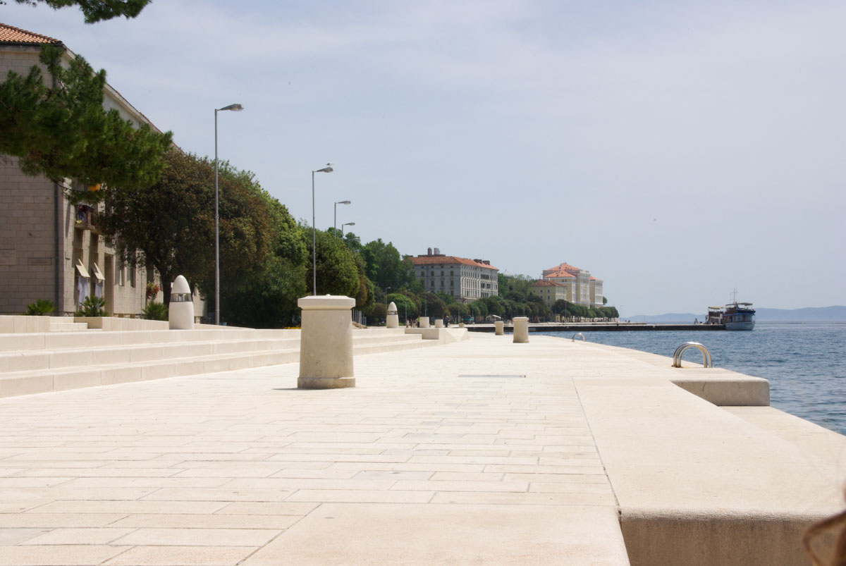 Les trous et tuyaux percés dans les dalles de pierre du quai font entendre des sons « musicaux » au gré des vagues et du ressac… C’est « l’orgue maritime »de Zadar, au bout des quais, face aux îles.