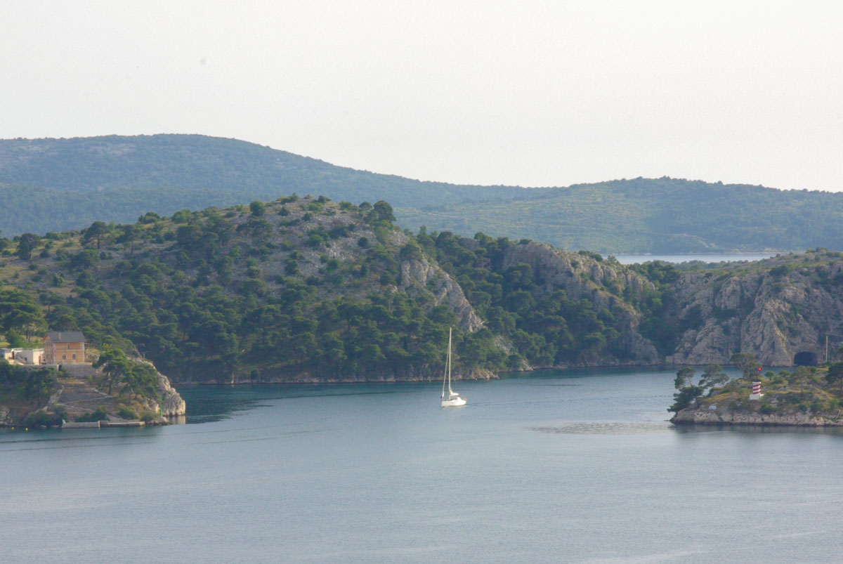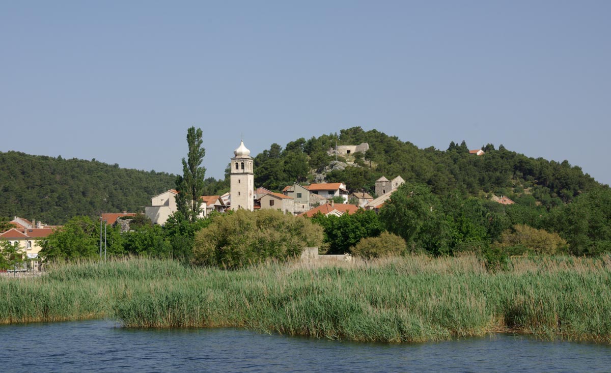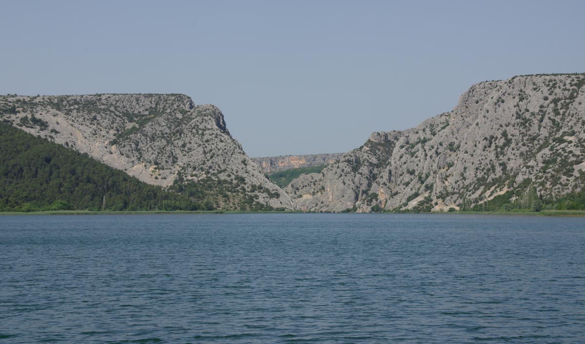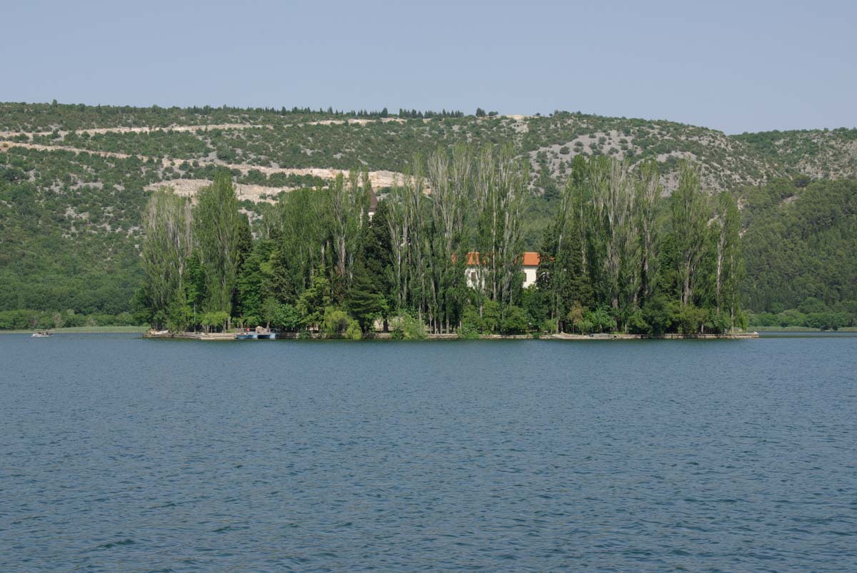 Après avoir longé le lacVisovac, encadré de falaises, nous arrivons à une petite plage de galets face à l‘île Sisovac, où se trouve un monastère.