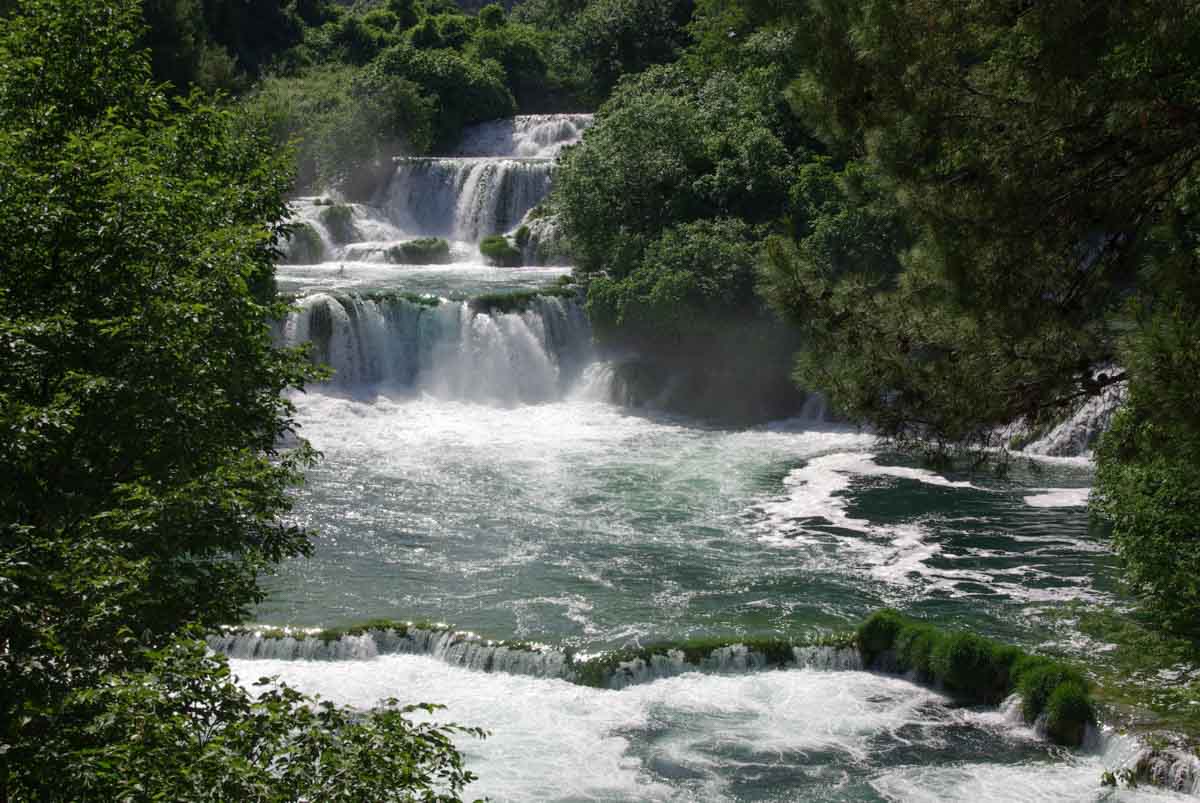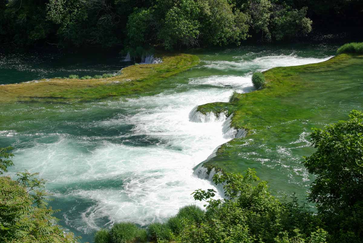 Nous cheminons sur les passerelles et belvédères qui surplombent les chutes d’eau provenant de la rivière Krka…